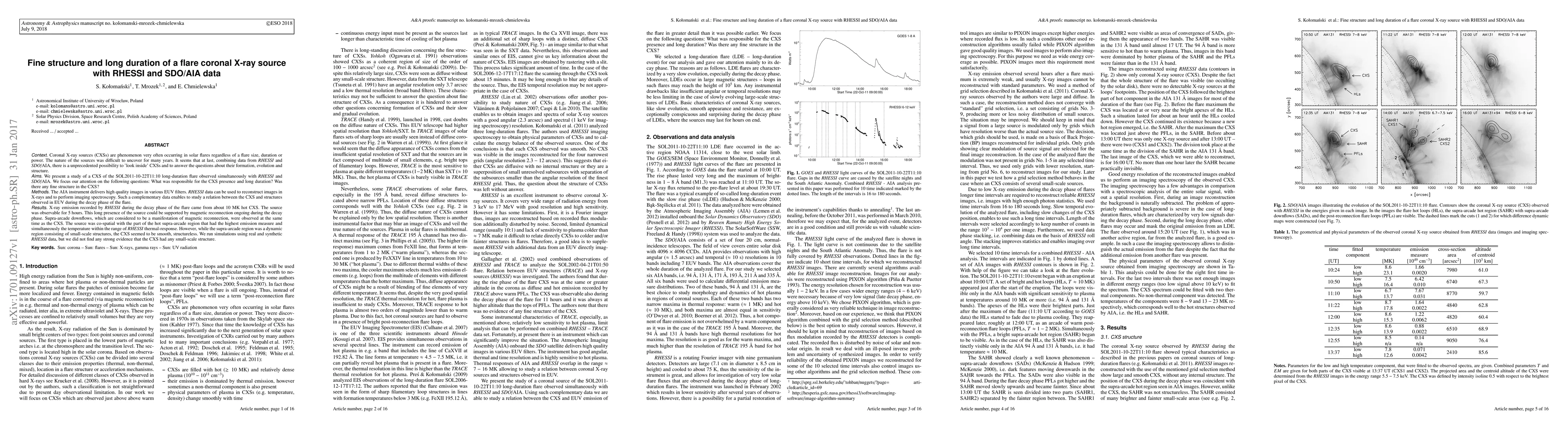 Coronal X-ray sources (CXSs) are phenomenon very often occurring in solar flares regardless of a flare size, duration or power. The nature of the sources was difficult to uncover for many years. It seems that at last, combining data from RHESSI and SDO/AIA, there is a unprecedented possibility to 'look inside' CXSs and to answer the questions about their formation, evolution and structure. We present a study of a CXS of the SOL2011-10-22T11:10 long-duration flare observed simultaneously with RHESSI and SDO/AIA. We focus our attention on the following questions: What was responsible for the CXS presence and long duration? Was there any fine structure in the CXS? Available data enables us to study a relation between the CXS and structures observed in EUV during the decay phase of the flare. X-ray emission recorded by RHESSI during the decay phase of the flare came from about 10 MK hot CXS. The source was observable for 5 hours. This long presence of the source could be supported by magnetic reconnection ongoing during the decay phase. Supra-arcade downflows, which are considered to be a manifestation of magnetic reconnection, were observed at the same time as the CXS. The source was co-spatial with the part of the hot supra-arcade region that had the highest emission measure and simultaneously the temperature within the range of RHESSI thermal-response. However, while the supra-arcade region was a dynamic region consisting of small-scale structures, the CXS seemed to be smooth, structureless. We run simulations using real and synthetic RHESSI data, but we did not find any strong evidence that the CXS had any small-scale structure.