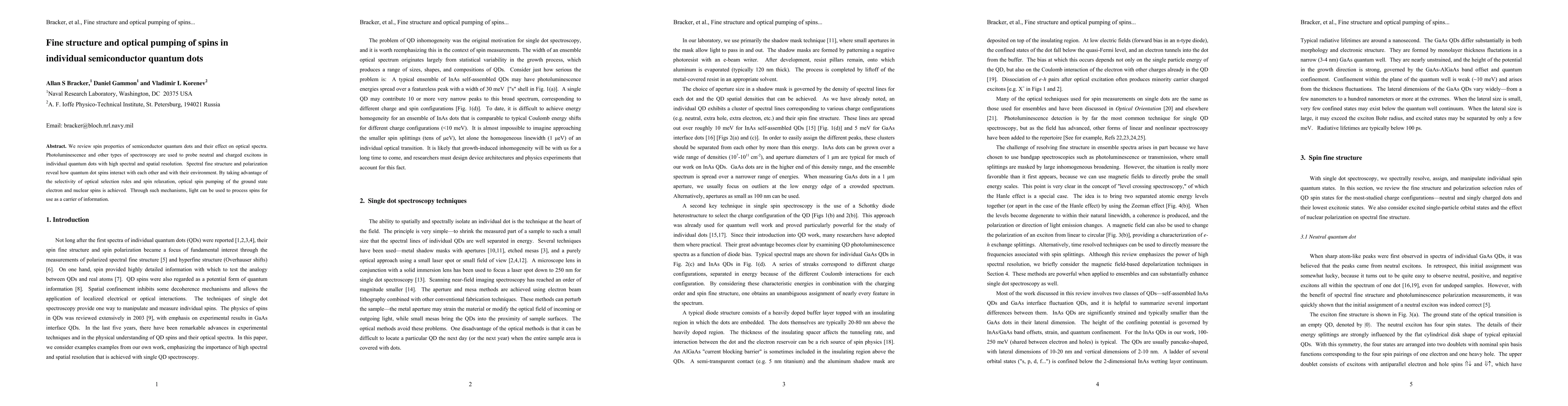 We review spin properties of semiconductor quantum dots and their effect on optical spectra. Photoluminescence and other types of spectroscopy are used to probe neutral and charged excitons in individual quantum dots with high spectral and spatial resolution. Spectral fine structure and polarization reveal how quantum dot spins interact with each other and with their environment. By taking advantage of the selectivity of optical selection rules and spin relaxation, optical spin pumping of the ground state electron and nuclear spins is achieved. Through such mechanisms, light can be used to process spins for use as a carrier of information.