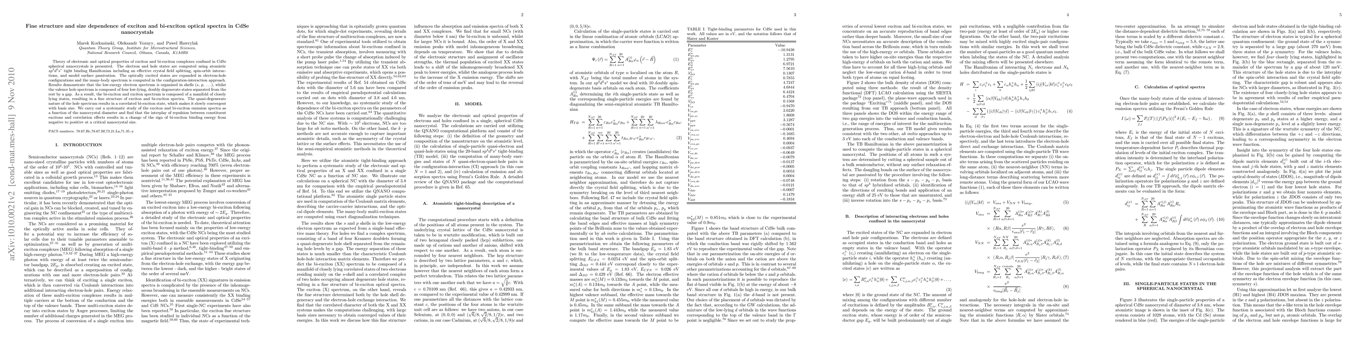 Theory of electronic and optical properties of exciton and bi-exciton complexes confined in CdSe spherical nanocrystals is presented. The electron and hole states are computed using atomistic $sp^3d^5s^*$ tight binding Hamiltonian including an effective crystal field splitting, spin-orbit interactions, and model surface passivation. The optically excited states are expanded in electron-hole configurations and the many-body spectrum is computed in the configuration-interaction approach. Results demonstrate that the low-energy electron spectrum is organized in shells ($s$, $p$, ...), whilst the valence hole spectrum is composed of four low-lying, doubly degenerate states separated from the rest by a gap. As a result, the bi-exciton and exciton spectrum is composed of a manifold of closely lying states, resulting in a fine structure of exciton and bi-exciton spectra. The quasi-degenerate nature of the hole spectrum results in a correlated bi-exciton state, which makes it slowly convergent with basis size. We carry out a systematic study of the exciton and bi-exciton emission spectra as a function of the nanocrystal diameter and find that the interplay of repulsion between constituent excitons and correlation effects results in a change of the sign of bi-exciton binding energy from negative to positive at a critical nanocrystal size.
