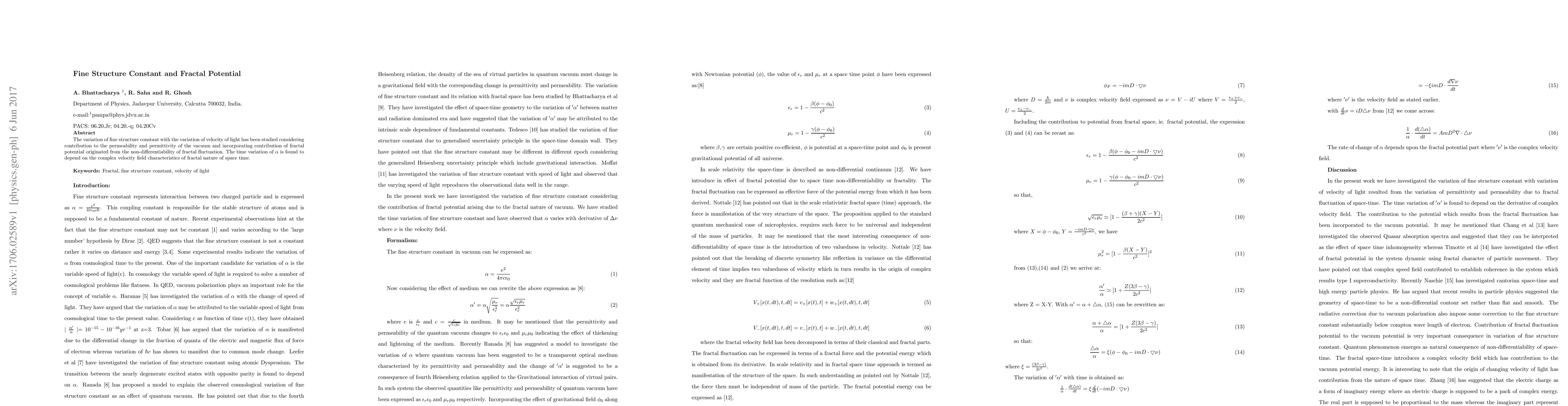 The paper investigates how the fine structure constant changes with variations in the speed of light, incorporating fractal potential effects from fractal fluctuations and their influence on vacuum permeability and permittivity. The time variation of the fine structure constant is found to be linked to the fractal nature of spacetime as indicated by the complex velocity field.