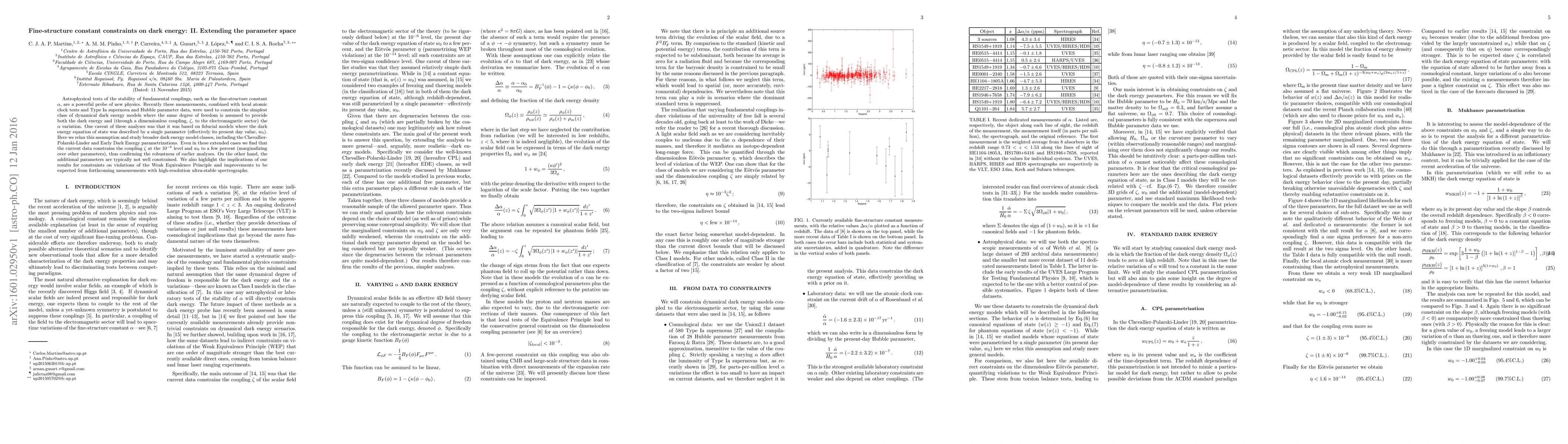 Astrophysical tests of the stability of fundamental couplings, such as the fine-structure constant $\alpha$, are a powerful probe of new physics. Recently these measurements, combined with local atomic clock tests and Type Ia supernova and Hubble parameter data, were used to constrain the simplest class of dynamical dark energy models where the same degree of freedom is assumed to provide both the dark energy and (through a dimensionless coupling, $\zeta$, to the electromagnetic sector) the $\alpha$ variation. One caveat of these analyses was that it was based on fiducial models where the dark energy equation of state was described by a single parameter (effectively its present day value, $w_0$). Here we relax this assumption and study broader dark energy model classes, including the Chevallier-Polarski-Linder and Early Dark Energy parametrizations. Even in these extended cases we find that the current data constrains the coupling $\zeta$ at the $10^{-6}$ level and $w_0$ to a few percent (marginalizing over other parameters), thus confirming the robustness of earlier analyses. On the other hand, the additional parameters are typically not well constrained. We also highlight the implications of our results for constraints on violations of the Weak Equivalence Principle and improvements to be expected from forthcoming measurements with high-resolution ultra-stable spectrographs.