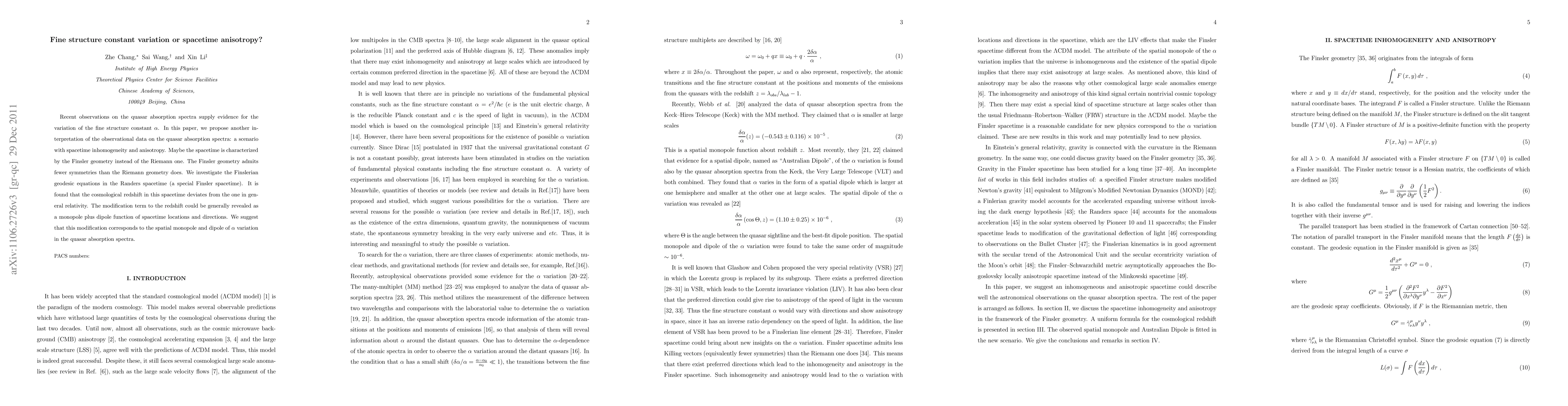Recent observations on the quasar absorption spectra supply evidence for the variation of the fine structure constant $\alpha$. In this paper, we propose another interpretation of the observational data on the quasar absorption spectra: a scenario with spacetime inhomogeneity and anisotropy. Maybe the spacetime is characterized by the Finsler geometry instead of the Riemann one. The Finsler geometry admits fewer symmetries than the Riemann geometry does. We investigate the Finslerian geodesic equations in the Randers spacetime (a special Finsler spacetime). It is found that the cosmological redshift in this spacetime deviates from the one in general relativity. The modification term to the redshift could be generally revealed as a monopole plus dipole function of spacetime locations and directions. We suggest that this modification corresponds to the spatial monopole and dipole of $\alpha$ variation in the quasar absorption spectra.
