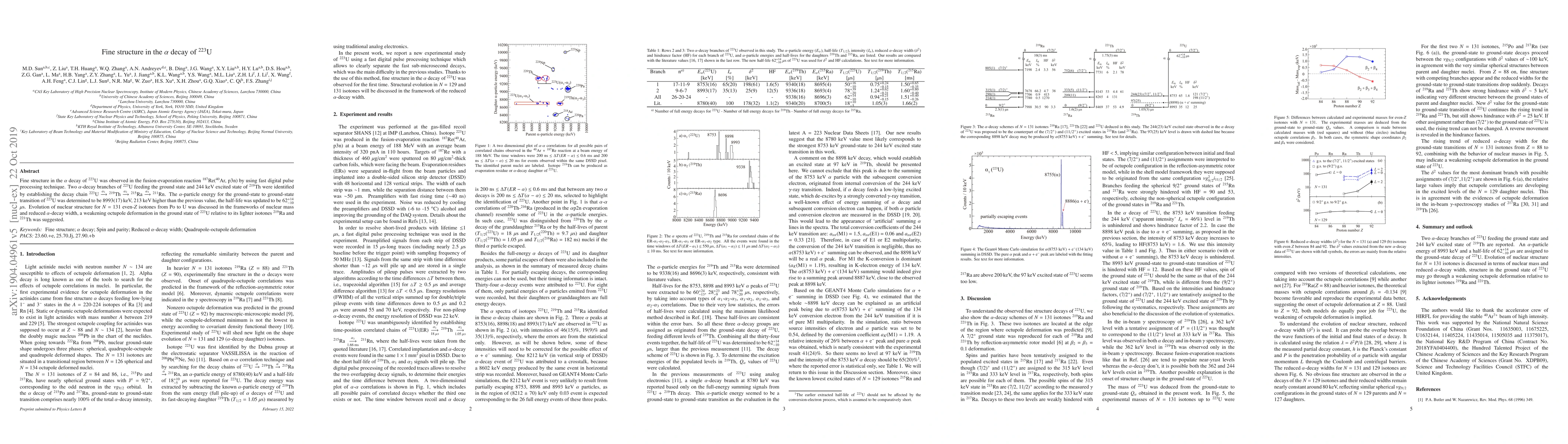 This study observes fine structure in the alpha decay of U-223 using a fusion-evaporation reaction, identifying two alpha-decay branches. The alpha-particle energy for the ground-state to ground-state transition was determined to be 8993(17) keV, higher than the previous value. The half-life was updated to 62+14_-10 microseconds. The findings suggest a weakening octupole deformation in the ground state of U-223 compared to its lighter isotones.