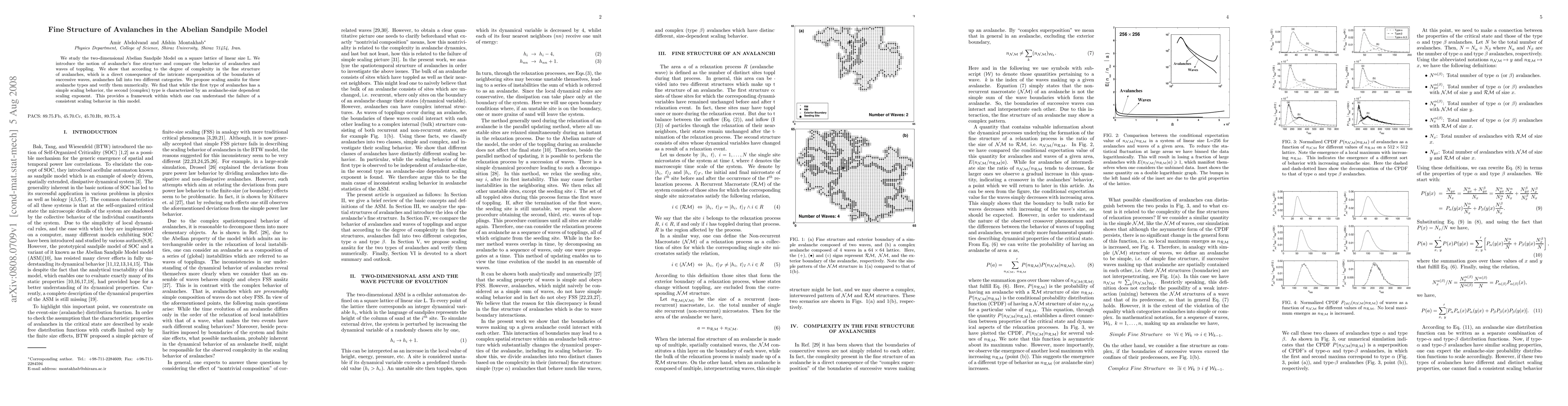 The paper investigates the fine structure of avalanches in the Abelian Sandpile Model on a square lattice, identifying two categories based on their complexity. It proposes scaling ansätze and finds that simple avalanches follow consistent scaling behavior, while complex ones exhibit an avalanche-size dependent scaling exponent.