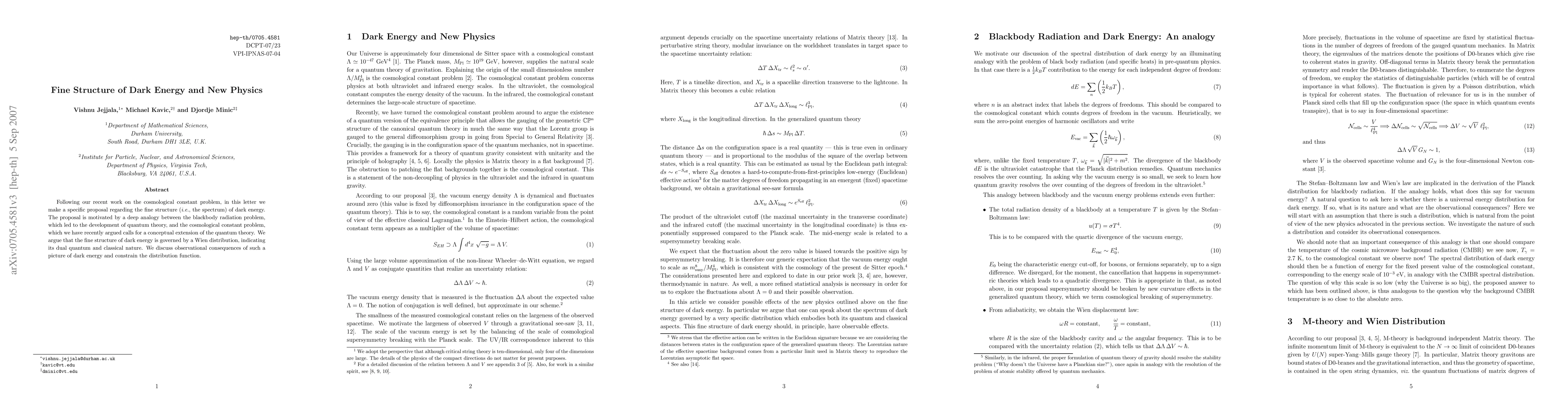 Following our recent work on the cosmological constant problem, in this letter we make a specific proposal regarding the fine structure (i.e., the spectrum) of dark energy. The proposal is motivated by a deep analogy between the blackbody radiation problem, which led to the development of quantum theory, and the cosmological constant problem, which we have recently argued calls for a conceptual extension of the quantum theory. We argue that the fine structure of dark energy is governed by a Wien distribution, indicating its dual quantum and classical nature. We discuss a few observational consequences of such a picture of dark energy.