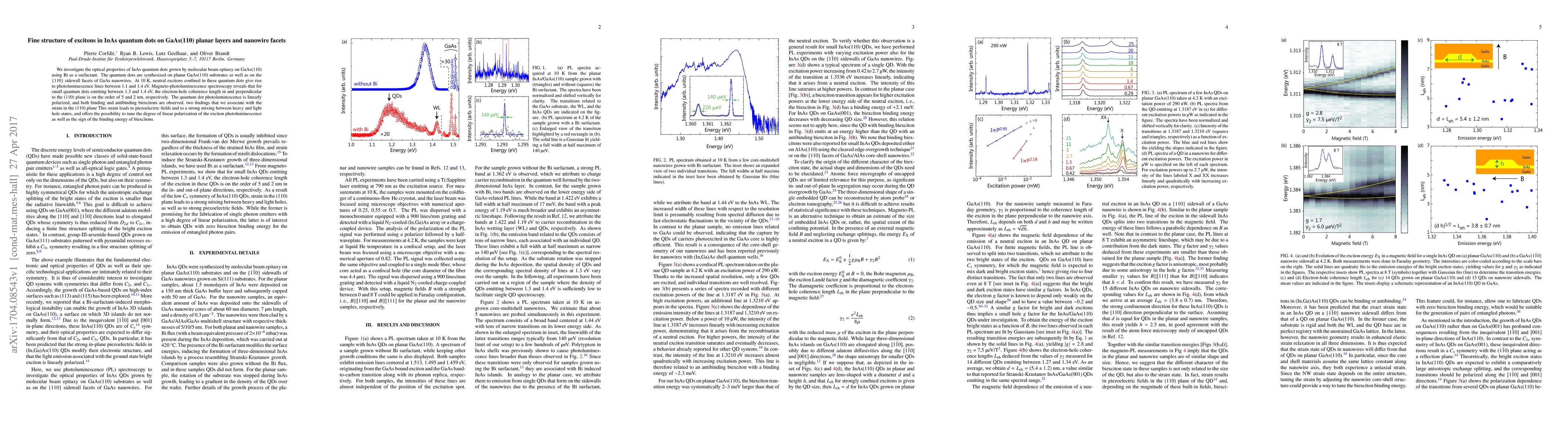 This study investigates the optical properties of InAs quantum dots on GaAs(110) substrates and nanowire facets, revealing neutral excitons with photoluminescence lines between 1.1 and 1.4 eV at 10 K. The electron-hole coherence length is found to be 5 nm in the plane and 2 nm perpendicular to it, while linear polarization and biexciton states are observed due to strain-induced piezoelectric fields.