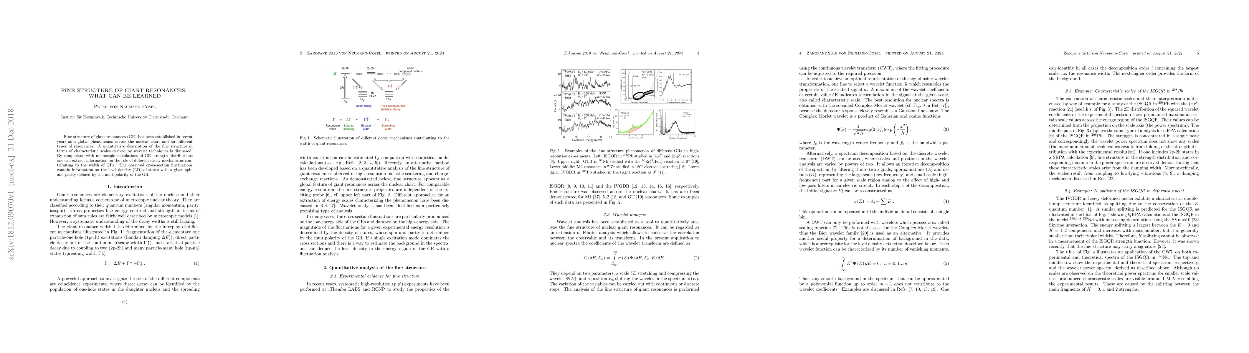 Fine structure of giant resonances (GR) has been established in recent years as a global phenomenon across the nuclear chart and for different types of resonances. A quantitative description of the fine structure in terms of characteristic scales derived by wavelet techniques is discussed. By comparison with microscpic calculations of GR strength distributions one can extract information on the role of different decay mechanisms contributing to the width of GRs. The observed cross-section fluctuations contain information on the level density (LD) of states with a given spin and parity defined by the multipolarity of the GR.
