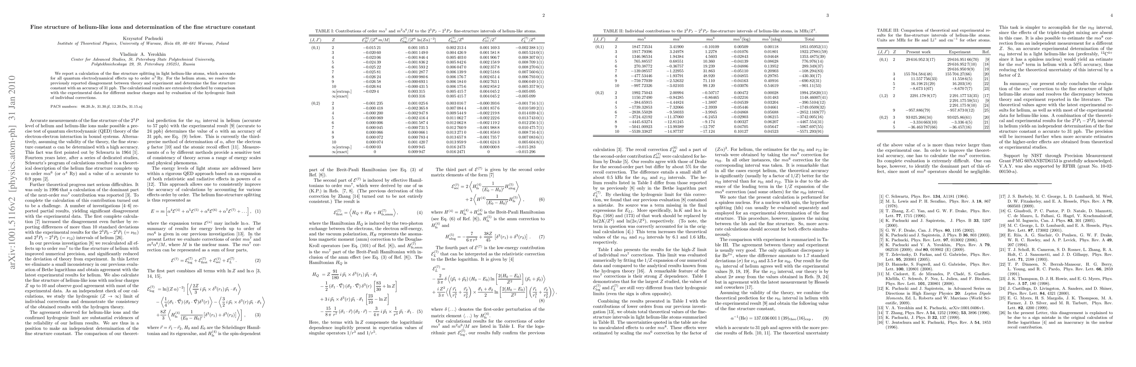 This paper presents a highly accurate calculation of the fine structure splitting in helium-like ions, resolving discrepancies between theoretical and experimental results for helium. The fine structure constant is determined with an unprecedented precision of 31 parts per billion.