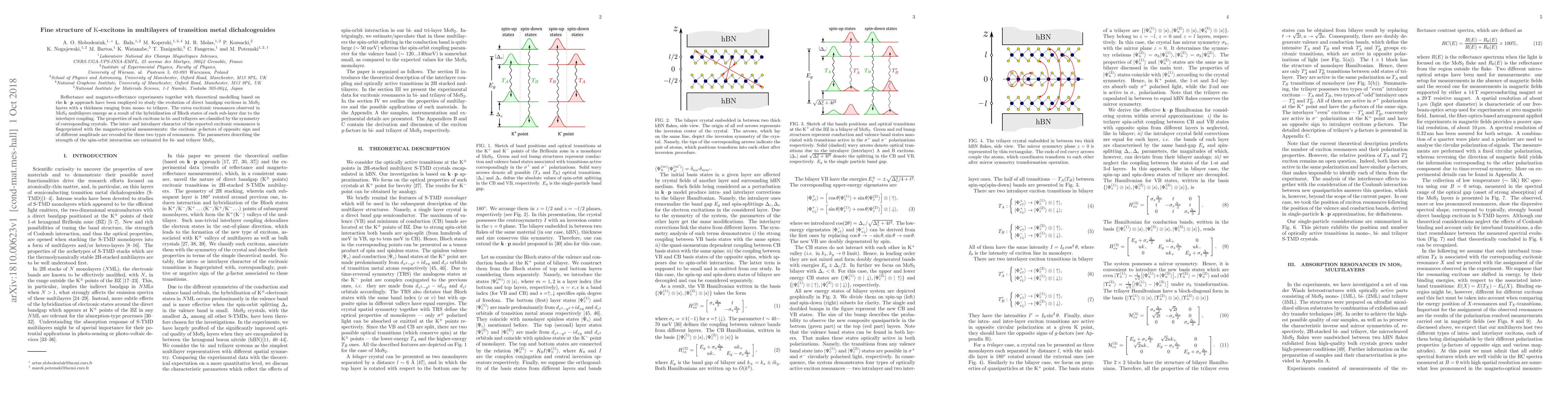 Reflectance and magneto-reflectance experiments together with theoretical modelling based on the $\mathbf{k\cdot p}$ approach have been employed to study the evolution of direct bandgap excitons in MoS$_2$ layers with a thickness ranging from mono- to trilayer. The extra excitonic resonances observed in MoS$_2$ multilayers emerge as a result of the hybridization of Bloch states of each sub-layer due to the interlayer coupling. The properties of such excitons in bi- and trilayers are classified by the symmetry of corresponding crystals. The inter- and intralayer character of the reported excitonic resonances is fingerprinted with the magneto-optical measurements: the excitonic $g$-factors of opposite sign and of different amplitude are revealed for these two types of resonances. The parameters describing the strength of the spin-orbit interaction are estimated for bi- and trilayer MoS$_2$.
