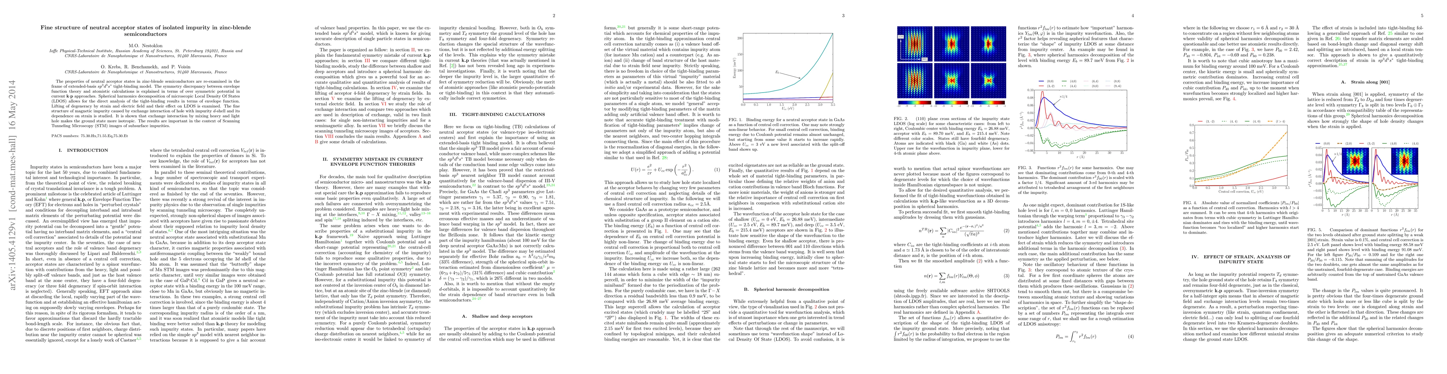 The properties of neutral acceptor states in zinc-blende semiconductors are re-examined in the frame of extended-basis $sp^3d^5s^*$ tight-binding model. The symmetry discrepancy between envelope function theory and atomistic calculations is explained in terms of over symmetric potential in current k$\cdot$p approaches. Spherical harmonics decomposition of microscopic Local Density Of States (LDOS) allows for the direct analysis of the tight-binding results in terms of envelope function. Lifting of degeneracy by strain and electric field and their effect on LDOS is examined. The fine structure of magnetic impurity caused by exchange interaction of hole with impurity $d$-shell and its dependence on strain is studied. It is shown that exchange interaction by mixing heavy and light hole makes the ground state more isotropic. The results are important in the context of Scanning Tunneling Microscopy (STM) images of subsurface impurities.