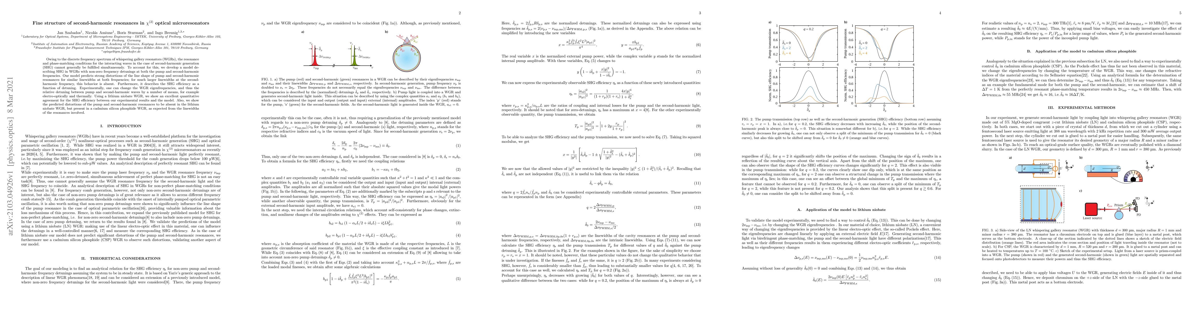 Owing to the discrete frequency spectrum of whispering gallery resonators (WGRs), the resonance and phase-matching conditions for the interacting waves in the case of second-harmonic generation (SHG) cannot generally be fulfilled simultaneously. To account for this, we develop a model describing SHG in WGRs with non-zero frequency detunings at both the pump and second-harmonic frequencies. Our model predicts strong distortions of the line shape of pump and second-harmonic resonances for similar linewidths at both frequencies; for much larger linewidths at the second-harmonic frequency, this behavior is absent. Furthermore, it describes the SHG efficiency as a function of detuning. Experimentally, one can change the WGR eigenfrequencies, and thus the relative detuning between pump and second-harmonic waves by a number of means, for example electro-optically and thermally. Using a lithium niobate WGR, we show an excellent quantitative agreement for the SHG efficiency between our experimental results and the model. Also, we show the predicted distortions of the pump and second-harmonic resonances to be absent in the lithium niobate WGR, but present in a cadmium silicon phosphide WGR, as expected from the linewidths of the resonances involved.