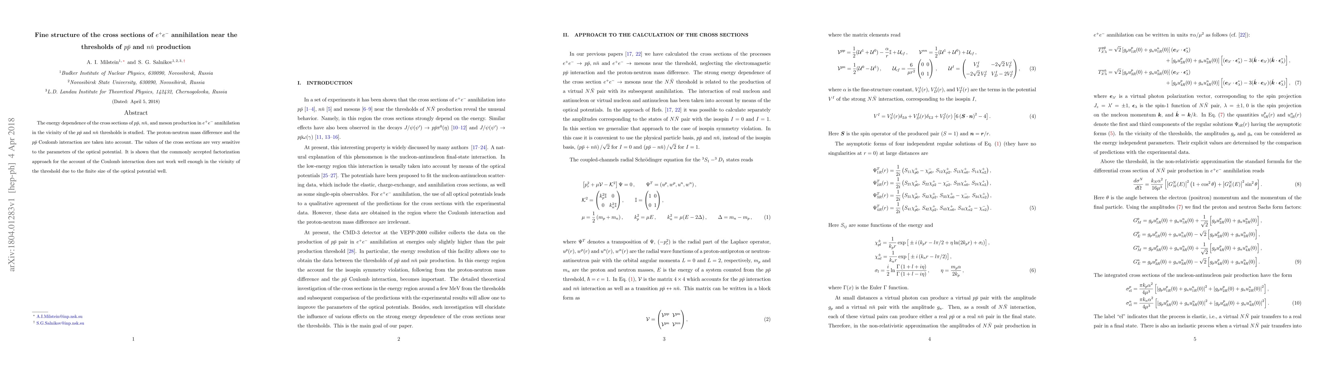 The energy dependence of the cross sections of $p\bar p$, $n\bar n$, and meson production in $e^+e^-$ annihilation in the vicinity of the $p\bar p$ and $n\bar n$ thresholds is studied. The proton-neutron mass difference and the $p\bar p$ Coulomb interaction are taken into account. The values of the cross sections are very sensitive to the parameters of the optical potential. It is shown that the commonly accepted factorization approach for the account of the Coulomb interaction does not work well enough in the vicinity of the threshold due to the finite size of the optical potential well.