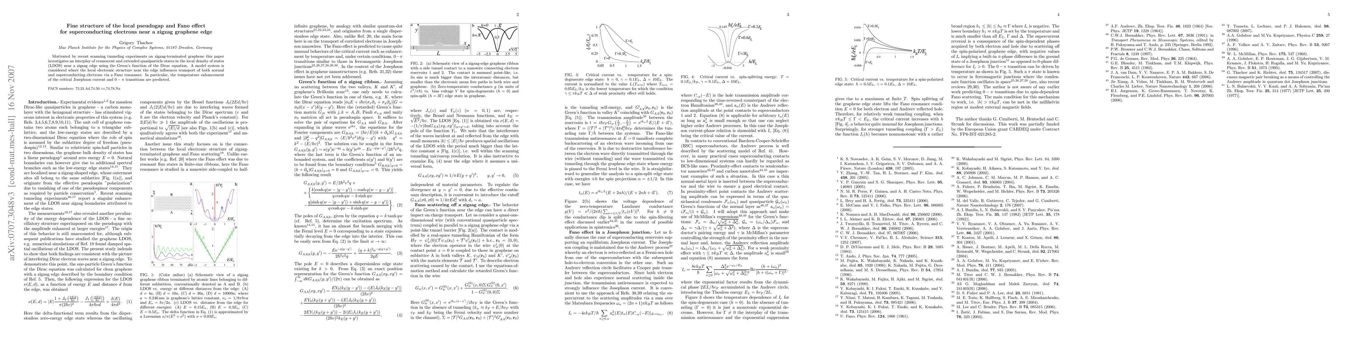 Motivated by recent scanning tunneling experiments on zigzag-terminated graphene this paper investigates an interplay of evanescent and extended quasiparticle states in the local density of states (LDOS) near a zigzag edge using the Green's function of the Dirac equation. A model system is considered where the local electronic structure near the edge influences transport of both normal and superconducting electrons via a Fano resonance. In particular, the temperature enhancement of the critical Josephson current and 0-pi transitions are predicted.