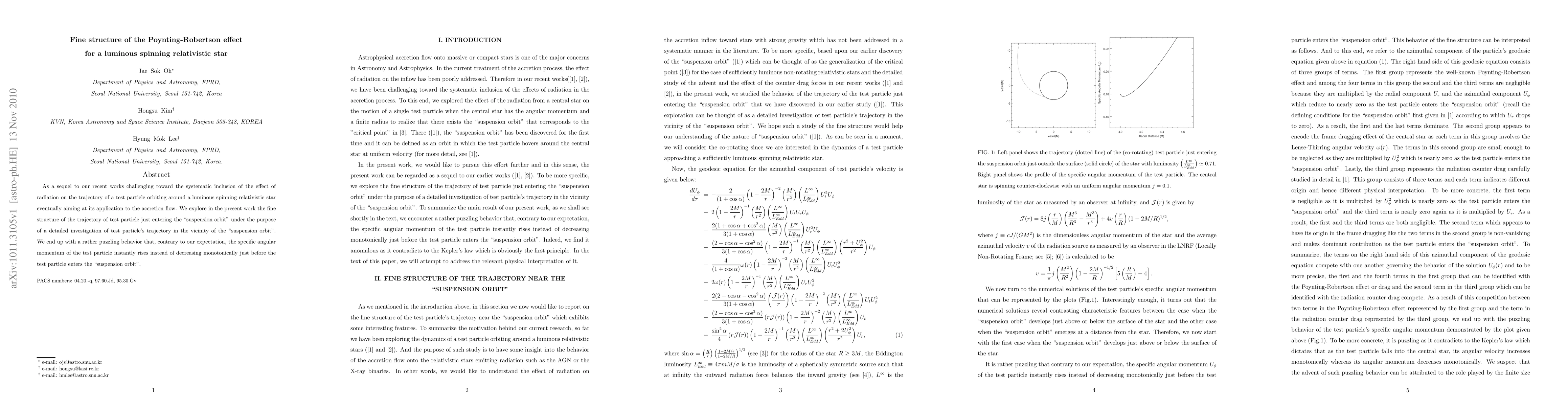 As a sequel to our recent works challenging toward the systematic inclusion of the effect of radiation on the trajectory of a test particle orbiting around a luminous spinning relativistic star eventually aiming at its application to the accretion flow. We explore in the present work the fine structure of the trajectory of test particle just entering the ``suspension orbit" under the purpose of a detailed investigation of test particle's trajectory in the vicinity of the ``suspension orbit". We end up with a rather puzzling behavior that, contrary to our expectation, the specific angular momentum of the test particle instantly rises instead of decreasing monotonically just before the test particle enters the ``suspension orbit".