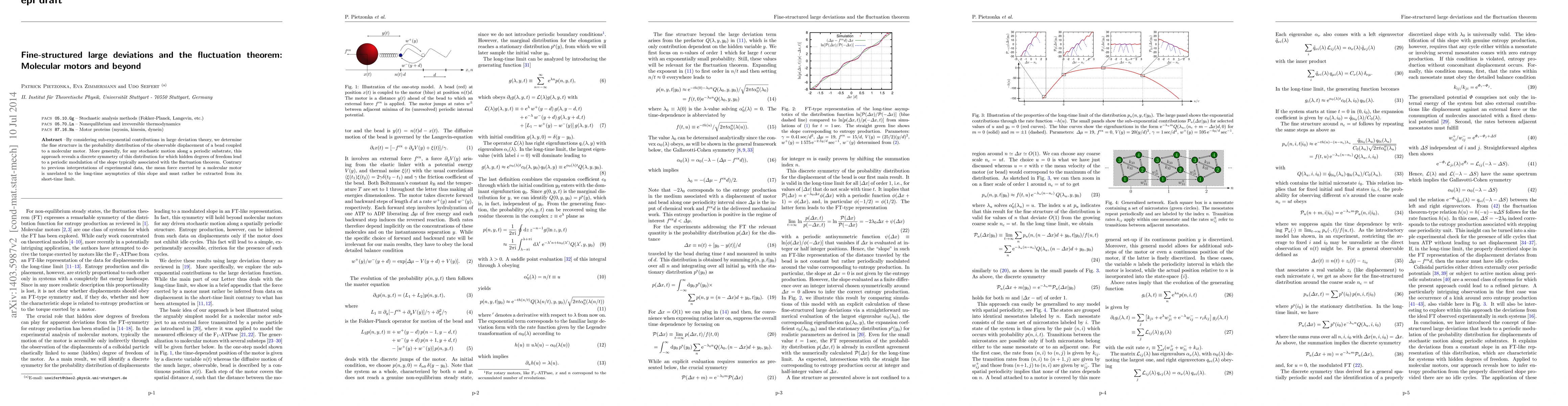 By considering subexponential contributions in large deviation theory, we determine the fine structure in the probability distribution of the observable displacement of a bead coupled to a molecular motor. More generally, for any stochastic motion along a periodic substrate, this approach reveals a discrete symmetry of this distribution for which hidden degrees of freedom lead to a periodic modulation of the slope typically associated with the fluctuation theorem. Contrary to previous interpretations of experimental data, the mean force exerted by a molecular motor is unrelated to the long-time asymptotics of this slope and must rather be extracted from its short-time limit.