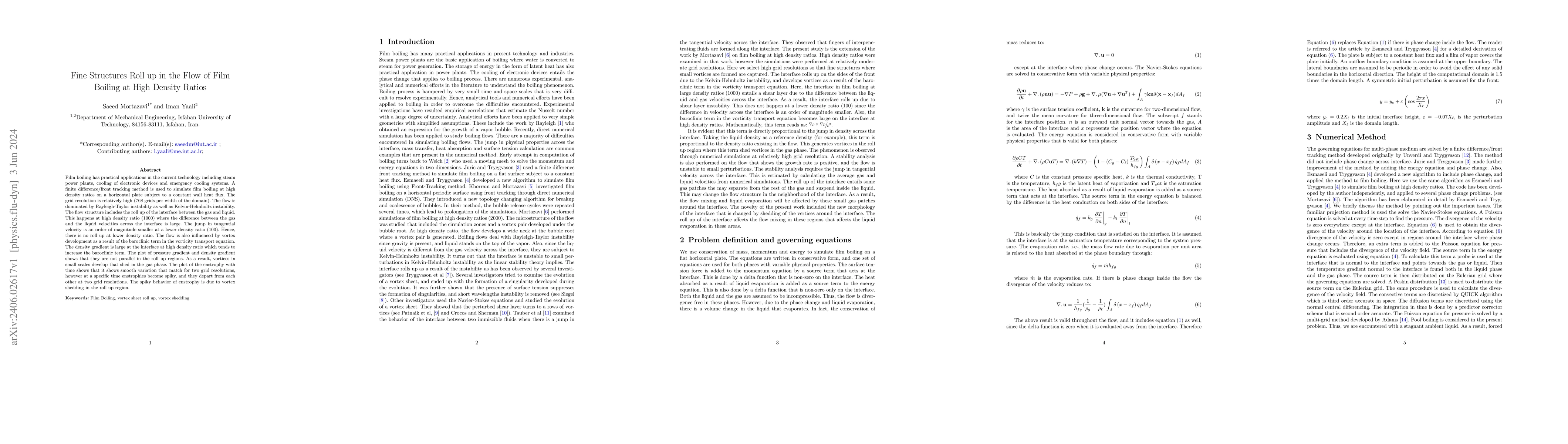 Film boiling has practical applications in the current technology including steam power plants, cooling of electronic devices and emergency cooling systems. A finite difference/front tracking method is used to simulate film boiling at high density ratios on a horizontal plate subject to a constant wall heat flux. The grid resolution is relatively high (768 grids per width of the domain). The flow is dominated by Rayleigh-Taylor instability as well as Kelvin-Helmholtz instability. The flow structure includes the roll up of the interface between the gas and liquid. This happens at high density ratio (1000) where the difference between the gas and the liquid velocities across the interface is large. The jump in tangential velocity is an order of magnitude smaller at a lower density ratio (100). Hence, there is no roll up at lower density ratio. The flow is also influenced by vortex development as a result of the baroclinic term in the vorticity transport equation. The density gradient is large at the interface at high density ratio which tends to increase the baroclinic term. The plot of pressure gradient and density gradient shows that they are not parallel in the roll up regions. As a result, vortices in small scales develop that shed in the gas phase. The plot of the enstrophy with time shows that it shows smooth variation that match for two grid resolutions, however at a specific time enstrophies become spiky, and they depart from each other at two grid resolutions. The spiky behavior of enstrophy is due to vortex shedding in the roll up region.