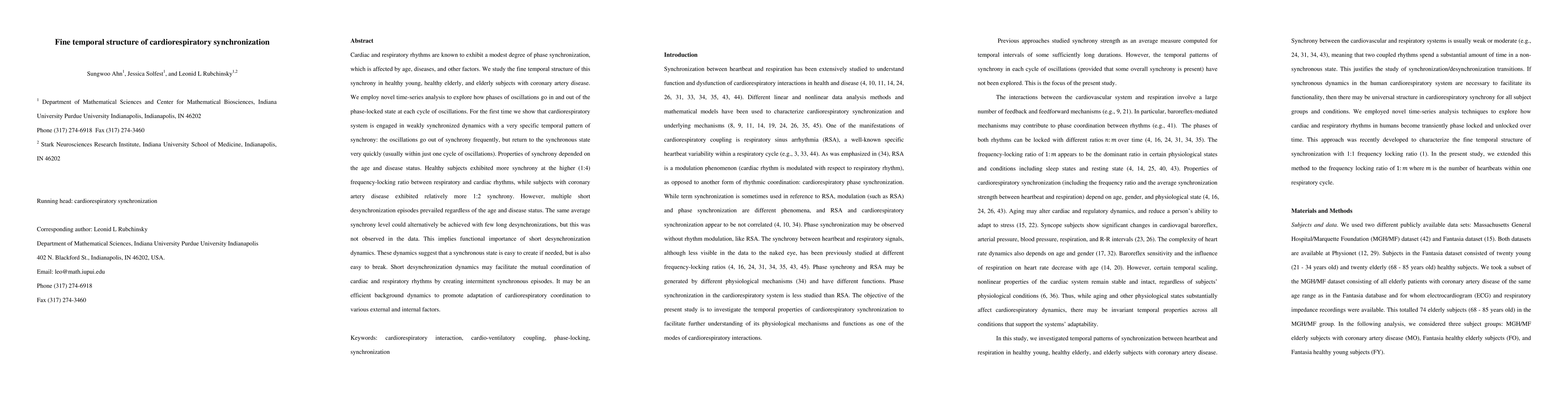 Cardiac and respiratory rhythms are known to exhibit a modest degree of phase synchronization, which is affected by age, diseases, and other factors. We study the fine temporal structure of this synchrony in healthy young, healthy elderly, and elderly subjects with coronary artery disease. We employ novel time-series analysis to explore how phases of oscillations go in and out of the phase-locked state at each cycle of oscillations. For the first time we show that cardiorespiratory system is engaged in weakly synchronized dynamics with a very specific temporal patterning of synchrony: the oscillations go out of synchrony frequently, but return to the synchronous state very quickly (usually within just one cycle of oscillations). Properties of synchrony depended on the age and disease status. Healthy subjects exhibited more synchrony at the higher (1:4) frequency-locking ratio between respiratory and cardiac rhythms, while subjects with coronary artery disease exhibited relatively more 1:2 synchrony. However, multiple short desynchronization episodes prevailed regardless of age and disease status. The same average synchrony level could alternatively be achieved with few long desynchronizations, but this was not observed in the data. This implies functional importance of short desynchronizations dynamics. These dynamics suggest that a synchronous state is easy to create if needed, but is also easy to break. Short desynchronizations dynamics may facilitate the mutual coordination of cardiac and respiratory rhythms by creating intermittent synchronous episodes. It may be an efficient background dynamics to promote adaptation of cardiorespiratory coordination to various external and internal factors.