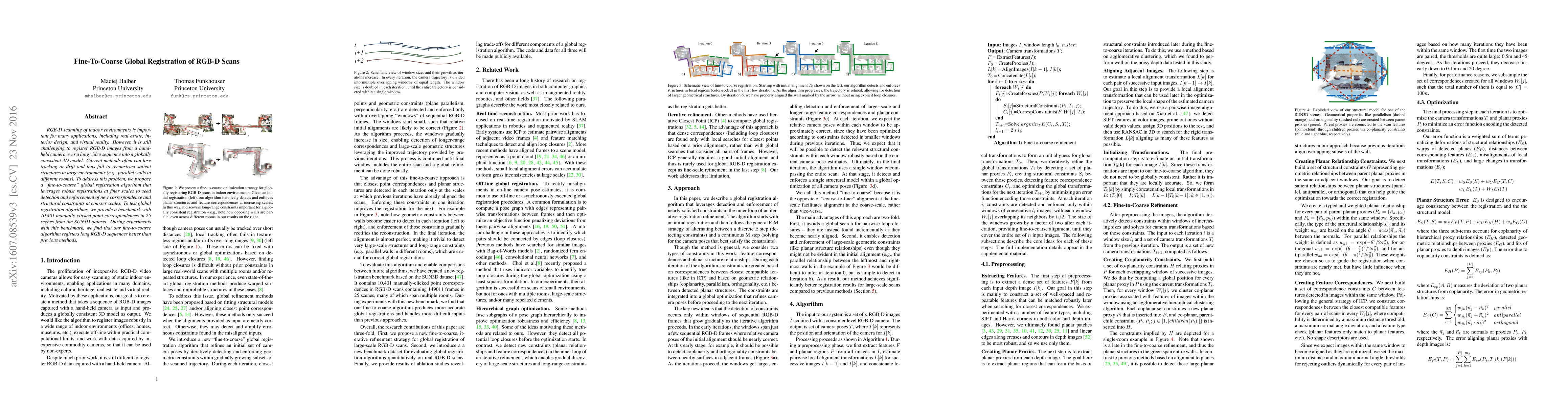 This paper proposes a "fine-to-coarse" global registration algorithm for RGB-D scans to improve the consistency of 3D models from hand-held camera sequences. The method outperforms existing techniques by leveraging finer-scale registrations to enforce structural constraints at larger scales.