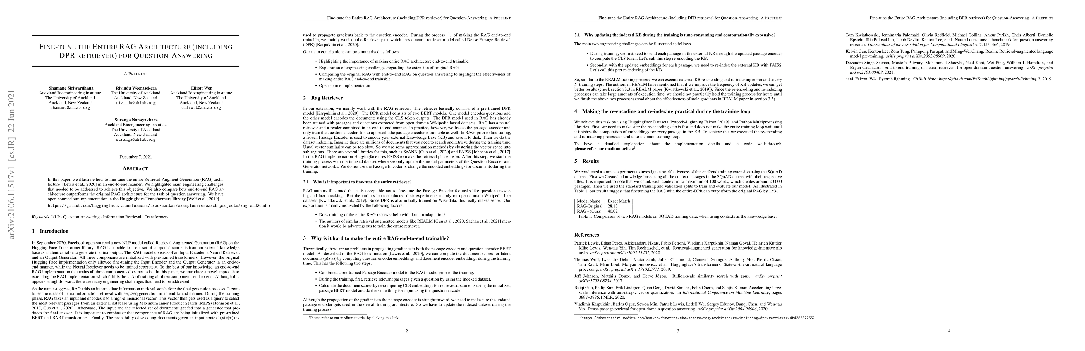 In this paper, we illustrate how to fine-tune the entire Retrieval Augment Generation (RAG) architecture in an end-to-end manner. We highlighted the main engineering challenges that needed to be addressed to achieve this objective. We also compare how end-to-end RAG architecture outperforms the original RAG architecture for the task of question answering. We have open-sourced our implementation in the HuggingFace Transformers library.
