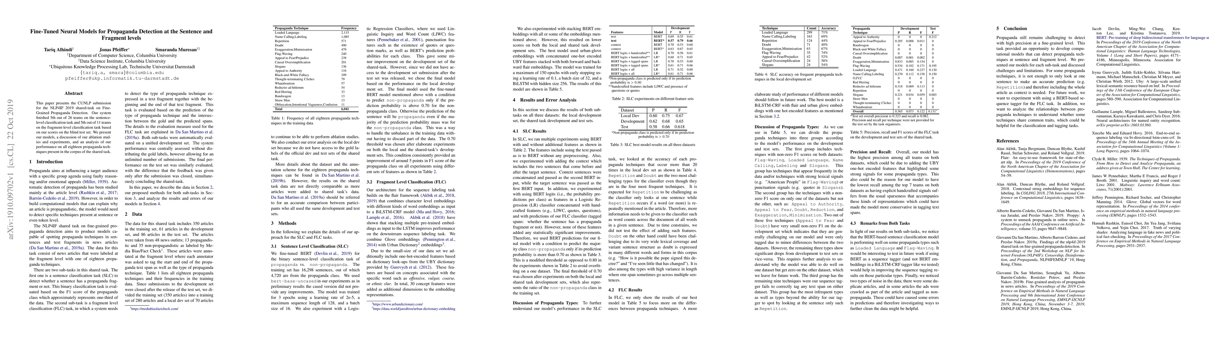 This paper presents the CUNLP submission for the NLP4IF 2019 shared-task on FineGrained Propaganda Detection. Our system finished 5th out of 26 teams on the sentence-level classification task and 5th out of 11 teams on the fragment-level classification task based on our scores on the blind test set. We present our models, a discussion of our ablation studies and experiments, and an analysis of our performance on all eighteen propaganda techniques present in the corpus of the shared task.