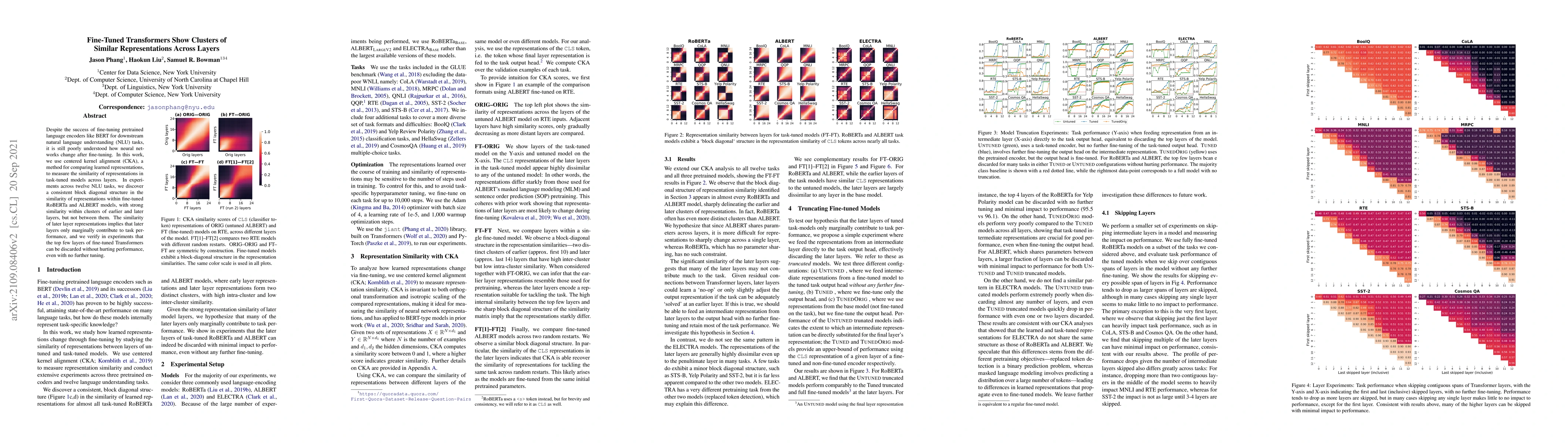Despite the success of fine-tuning pretrained language encoders like BERT for downstream natural language understanding (NLU) tasks, it is still poorly understood how neural networks change after fine-tuning. In this work, we use centered kernel alignment (CKA), a method for comparing learned representations, to measure the similarity of representations in task-tuned models across layers. In experiments across twelve NLU tasks, we discover a consistent block diagonal structure in the similarity of representations within fine-tuned RoBERTa and ALBERT models, with strong similarity within clusters of earlier and later layers, but not between them. The similarity of later layer representations implies that later layers only marginally contribute to task performance, and we verify in experiments that the top few layers of fine-tuned Transformers can be discarded without hurting performance, even with no further tuning.