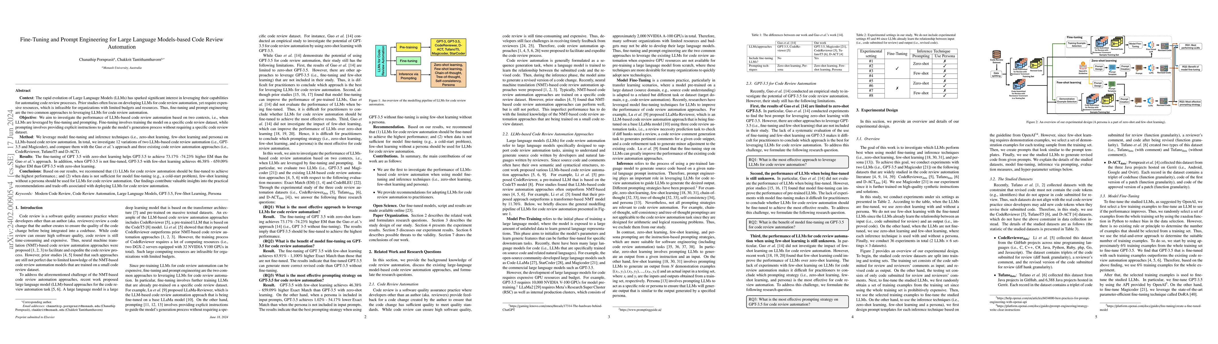 This study evaluates the effectiveness of fine-tuning and prompt engineering for large language models in automating code reviews. Results show that fine-tuning LLMs, particularly GPT-3.5 with zero-shot learning, significantly outperforms existing methods, while few-shot learning can serve as an alternative when fine-tuning data is unavailable.