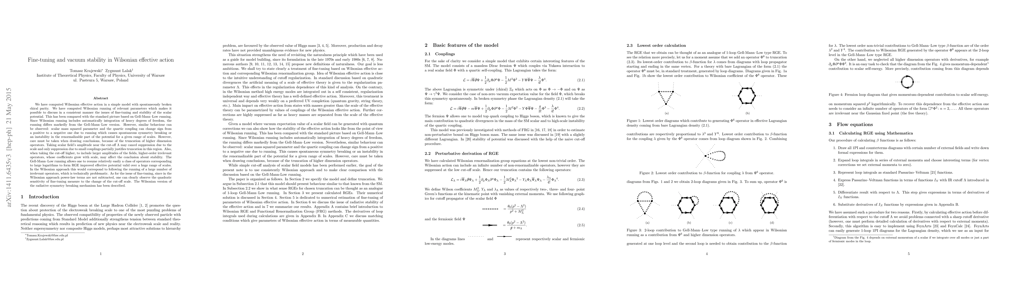 Researchers computed Wilsonian effective action in a model with scalar field and Dirac fermion, finding power-law sensitivity of fine-tuning to cut-off scale, differing from traditional Gell-Mann-Low running.