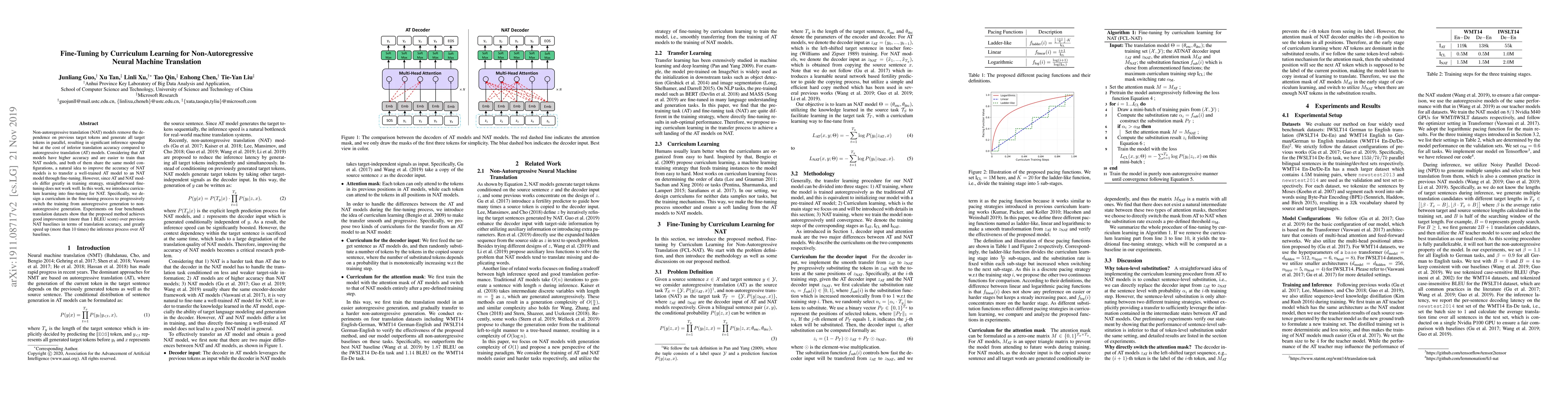 This paper proposes a curriculum learning approach to fine-tune non-autoregressive neural machine translation models, improving their translation accuracy while maintaining parallel generation speed. The method progressively shifts training from autoregressive to non-autoregressive strategies, achieving over $1$ BLEU score improvement and $10x$ faster inference compared to autoregressive baselines.