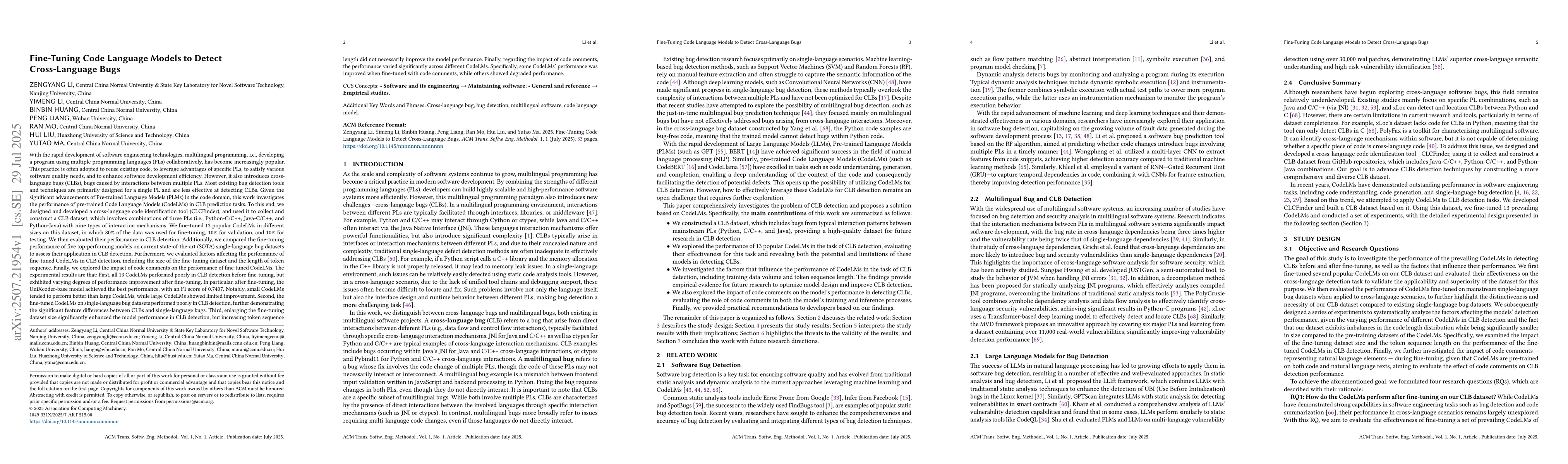 The research fine-tunes 13 pre-trained Code Language Models (CodeLMs) on a cross-language bug (CLB) dataset comprising three programming language combinations and nine interaction types. It evaluates their performance in detecting CLBs, analyzing the effects of dataset size, token sequence length, and code comments.