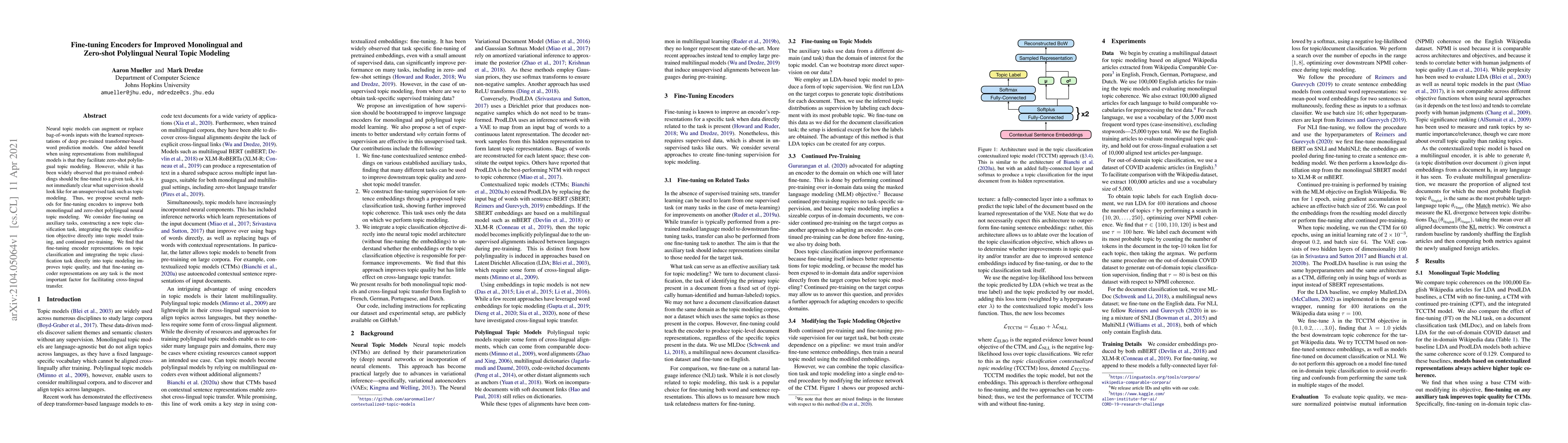 This paper proposes fine-tuning methods for encoders in neural topic models to enhance monolingual and zero-shot polylingual topic modeling. The study finds that fine-tuning on topic classification and integrating this task into topic modeling improves topic quality, with fine-tuning being crucial for cross-lingual transfer.