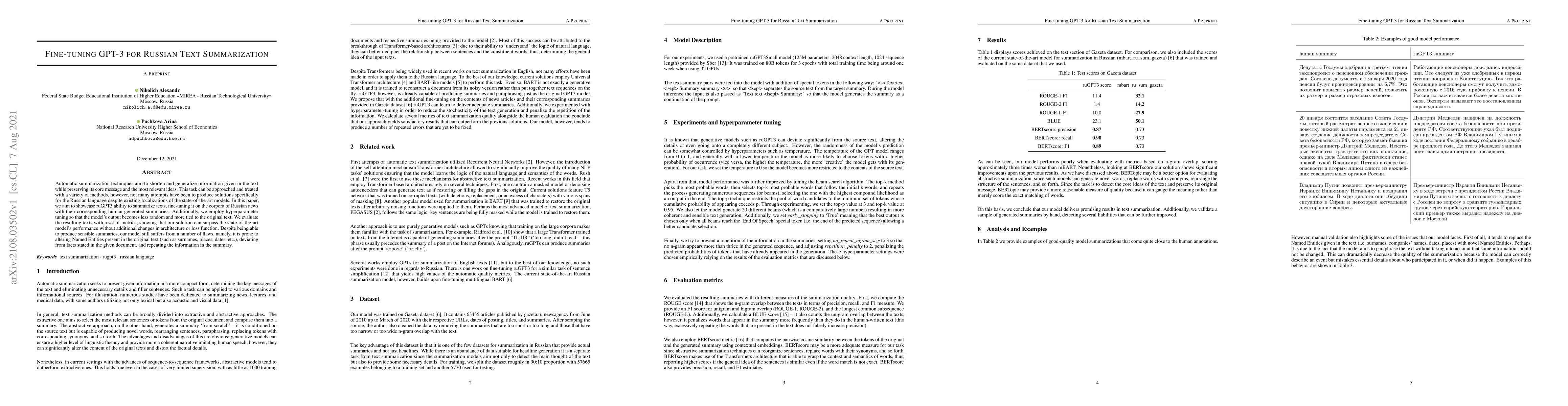 Automatic summarization techniques aim to shorten and generalize information given in the text while preserving its core message and the most relevant ideas. This task can be approached and treated with a variety of methods, however, not many attempts have been made to produce solutions specifically for the Russian language despite existing localizations of the state-of-the-art models. In this paper, we aim to showcase ruGPT3 ability to summarize texts, fine-tuning it on the corpora of Russian news with their corresponding human-generated summaries. Additionally, we employ hyperparameter tuning so that the model's output becomes less random and more tied to the original text. We evaluate the resulting texts with a set of metrics, showing that our solution can surpass the state-of-the-art model's performance without additional changes in architecture or loss function. Despite being able to produce sensible summaries, our model still suffers from a number of flaws, namely, it is prone to altering Named Entities present in the original text (such as surnames, places, dates), deviating from facts stated in the given document, and repeating the information in the summary.