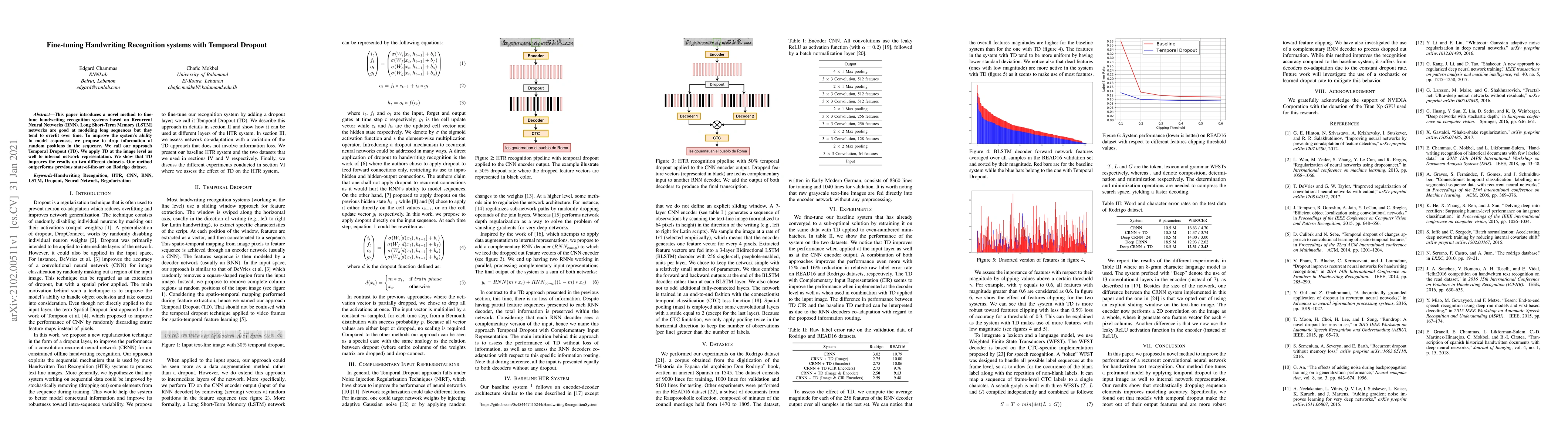 This paper proposes Temporal Dropout (TD) to fine-tune handwriting recognition systems based on LSTM networks, improving sequence modeling and reducing overfitting. TD applied at both image and network representation levels enhances performance, outperforming previous methods on the Rodrigo dataset.