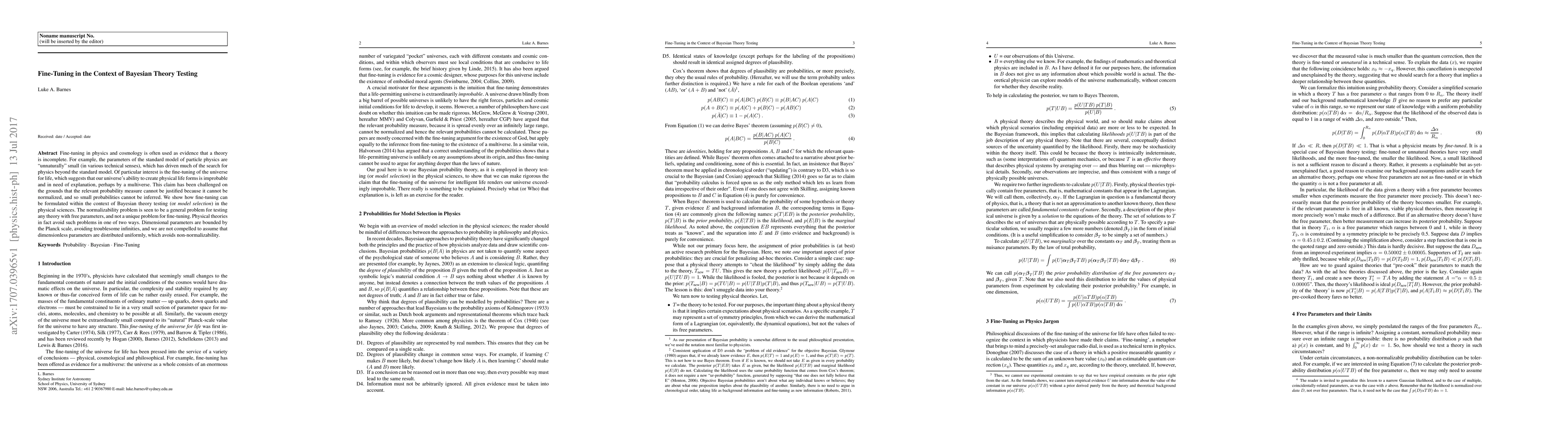This paper explores how fine-tuning in physics can be addressed within Bayesian theory testing, demonstrating that the normalization issue is a general challenge for theories with free parameters. It concludes that physical theories circumvent this issue either by bounding dimensional parameters or by not assuming uniform distributions for dimensionless parameters.