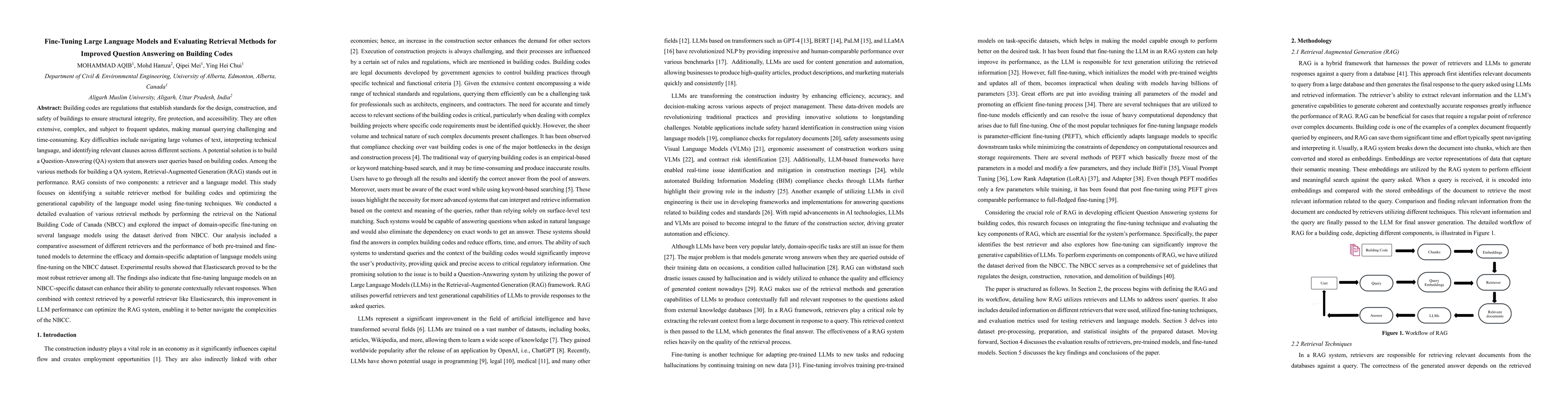 Building codes are regulations that establish standards for the design, construction, and safety of buildings to ensure structural integrity, fire protection, and accessibility. They are often extensive, complex, and subject to frequent updates, making manual querying challenging and time-consuming. Key difficulties include navigating large volumes of text, interpreting technical language, and identifying relevant clauses across different sections. A potential solution is to build a Question-Answering (QA) system that answers user queries based on building codes. Among the various methods for building a QA system, Retrieval-Augmented Generation (RAG) stands out in performance. RAG consists of two components: a retriever and a language model. This study focuses on identifying a suitable retriever method for building codes and optimizing the generational capability of the language model using fine-tuning techniques. We conducted a detailed evaluation of various retrieval methods by performing the retrieval on the National Building Code of Canada (NBCC) and explored the impact of domain-specific fine-tuning on several language models using the dataset derived from NBCC. Our analysis included a comparative assessment of different retrievers and the performance of both pre-trained and fine-tuned models to determine the efficacy and domain-specific adaptation of language models using fine-tuning on the NBCC dataset. Experimental results showed that Elasticsearch proved to be the most robust retriever among all. The findings also indicate that fine-tuning language models on an NBCC-specific dataset can enhance their ability to generate contextually relevant responses. When combined with context retrieved by a powerful retriever like Elasticsearch, this improvement in LLM performance can optimize the RAG system, enabling it to better navigate the complexities of the NBCC.