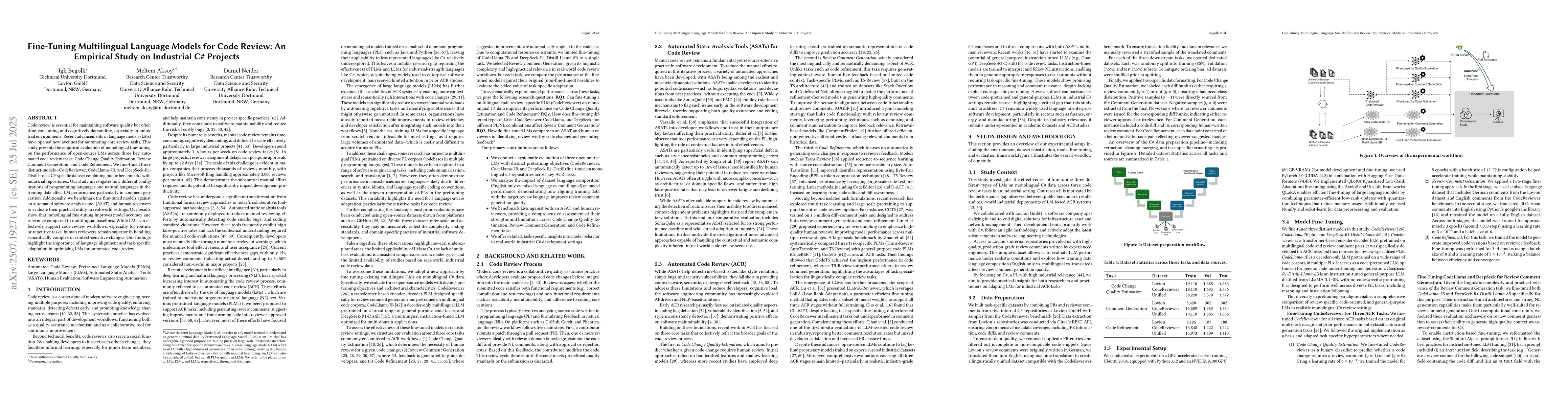 Code review is essential for maintaining software quality but often time-consuming and cognitively demanding, especially in industrial environments. Recent advancements in language models (LMs) have opened new avenues for automating core review tasks. This study presents the empirical evaluation of monolingual fine-tuning on the performance of open-source LMs across three key automated code review tasks: Code Change Quality Estimation, Review Comment Generation, and Code Refinement. We fine-tuned three distinct models, CodeReviewer, CodeLlama-7B, and DeepSeek-R1-Distill, on a C\# specific dataset combining public benchmarks with industrial repositories. Our study investigates how different configurations of programming languages and natural languages in the training data affect LM performance, particularly in comment generation. Additionally, we benchmark the fine-tuned models against an automated software analysis tool (ASAT) and human reviewers to evaluate their practical utility in real-world settings. Our results show that monolingual fine-tuning improves model accuracy and relevance compared to multilingual baselines. While LMs can effectively support code review workflows, especially for routine or repetitive tasks, human reviewers remain superior in handling semantically complex or context-sensitive changes. Our findings highlight the importance of language alignment and task-specific adaptation in optimizing LMs for automated code review.