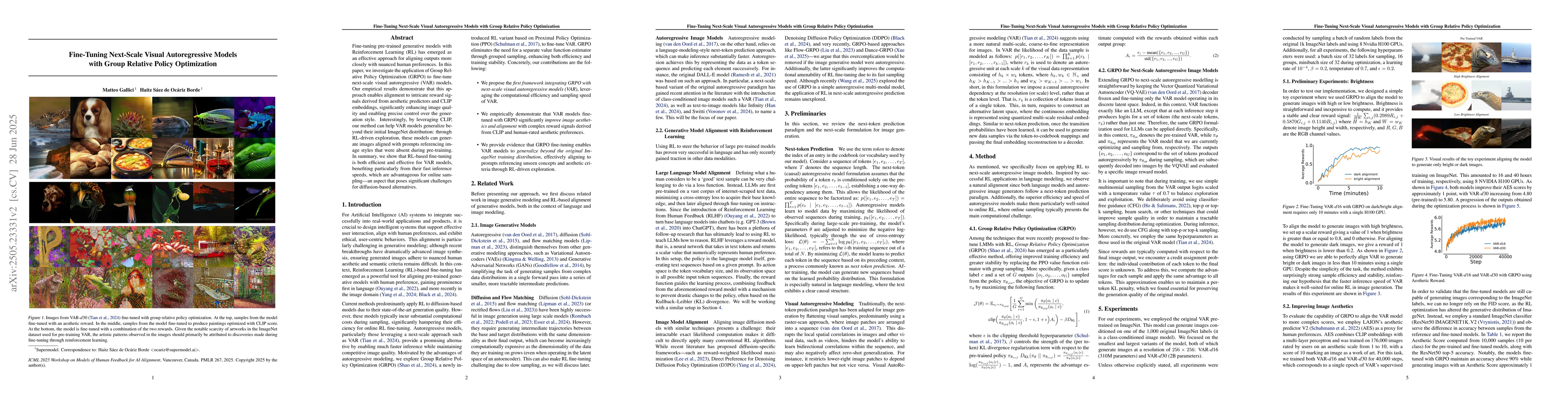 The research applies Group Relative Policy Optimization (GRPO) to fine-tune next-scale visual autoregressive (VAR) models, leveraging CLIP embeddings for alignment with nuanced human preferences and aesthetic predictors.