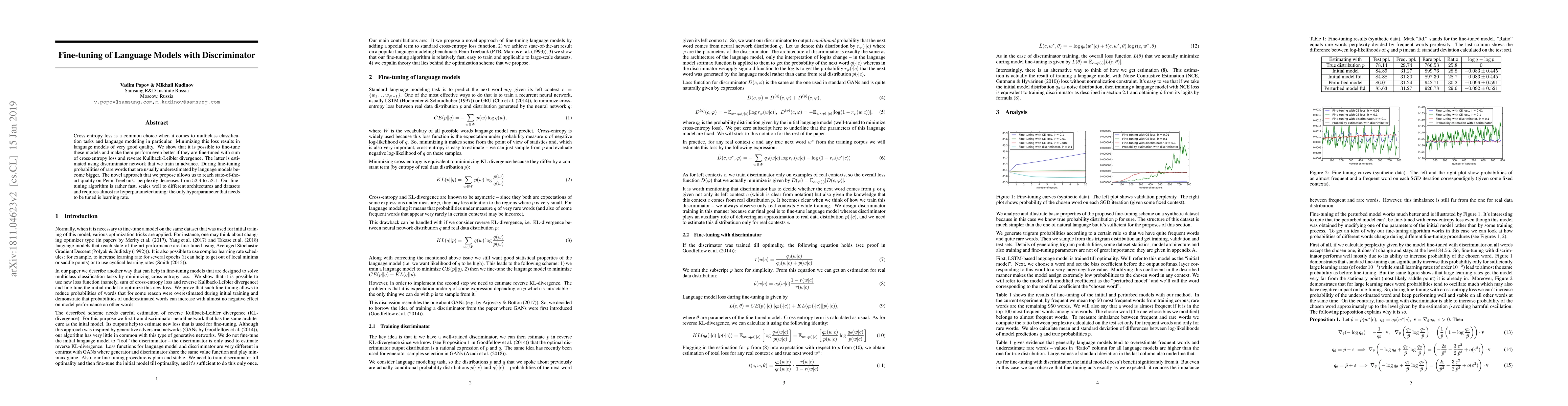 Cross-entropy loss is a common choice when it comes to multiclass classification tasks and language modeling in particular. Minimizing this loss results in language models of very good quality. We show that it is possible to fine-tune these models and make them perform even better if they are fine-tuned with sum of cross-entropy loss and reverse Kullback-Leibler divergence. The latter is estimated using discriminator network that we train in advance. During fine-tuning probabilities of rare words that are usually underestimated by language models become bigger. The novel approach that we propose allows us to reach state-of-the-art quality on Penn Treebank: perplexity decreases from 52.4 to 52.1. Our fine-tuning algorithm is rather fast, scales well to different architectures and datasets and requires almost no hyperparameter tuning: the only hyperparameter that needs to be tuned is learning rate.