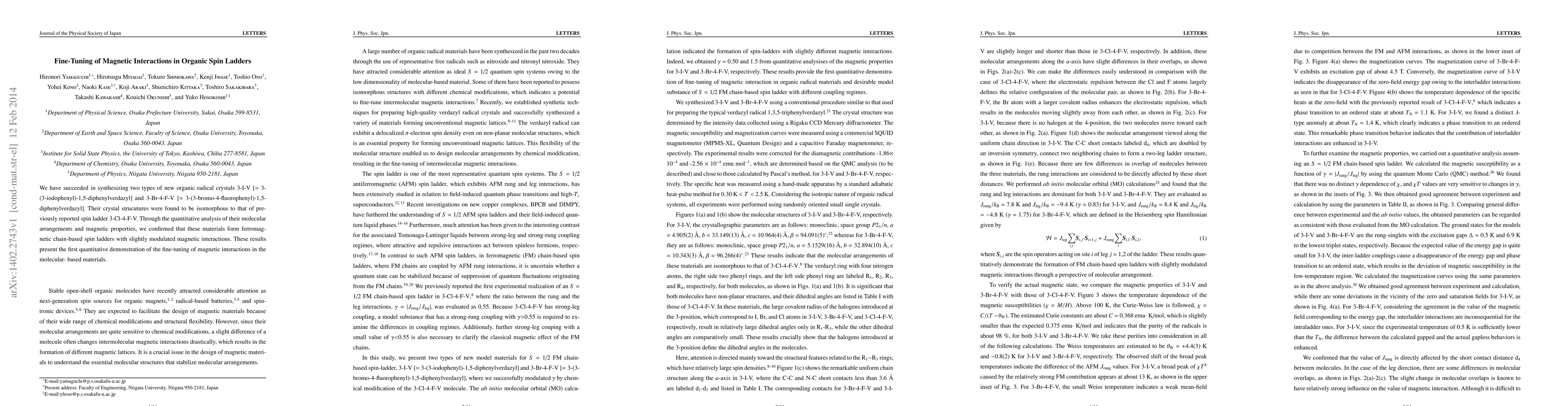 The paper details the synthesis of two novel organic radical crystals, 3-I-V and 3-Br-4-F-V, which form ferromagnetic chain-based spin ladders. This work presents the first quantitative evidence of fine-tuning magnetic interactions in molecular-based materials.