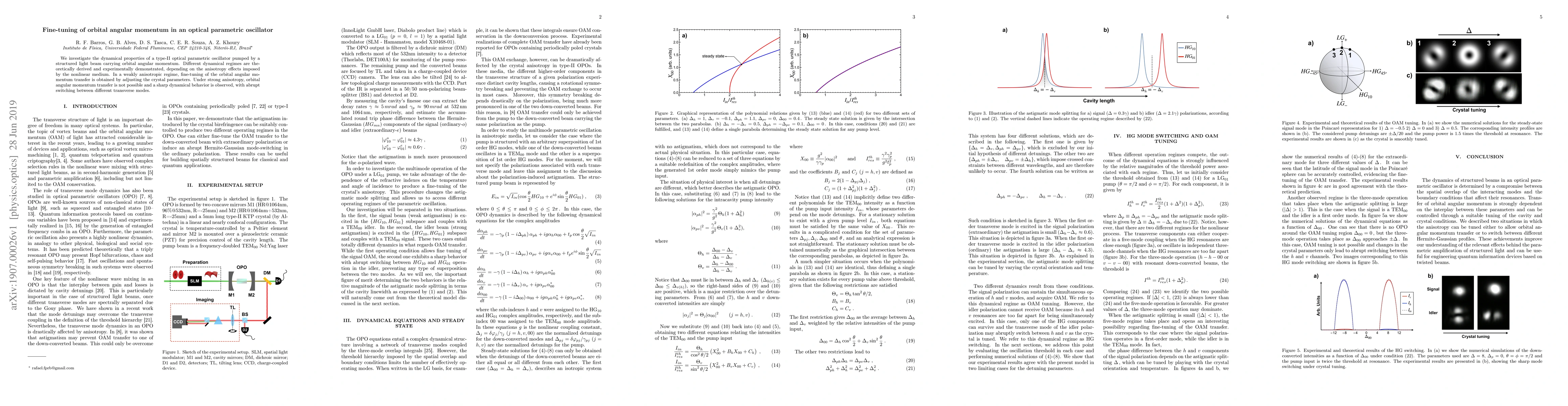 This paper explores the dynamics of a type-II optical parametric oscillator driven by a structured light beam, demonstrating different regimes based on the anisotropy effects of the nonlinear medium. Fine-tuning of orbital angular momentum is achieved in weakly anisotropic conditions by adjusting crystal parameters, while strong anisotropy leads to abrupt switching between transverse modes.