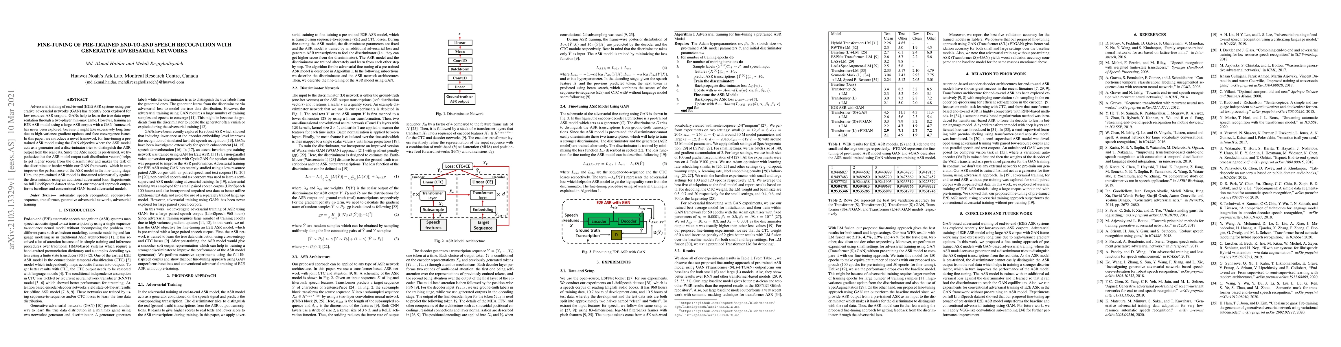 This paper proposes a novel framework for fine-tuning pre-trained end-to-end speech recognition models using generative adversarial networks (GANs), achieving better performance than baselines. The GAN framework leverages the pre-trained model's output to enhance the discriminator's difficulty, improving the ASR model's performance during fine-tuning.