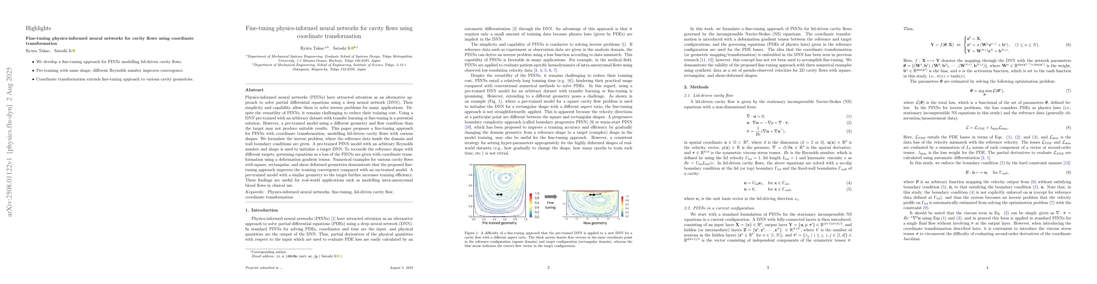 Physics-informed neural networks (PINNs) have attracted attention as an alternative approach to solve partial differential equations using a deep neural network (DNN). Their simplicity and capability allow them to solve inverse problems for many applications. Despite the versatility of PINNs, it remains challenging to reduce their training cost. Using a DNN pre-trained with an arbitrary dataset with transfer learning or fine-tuning is a potential solution. However, a pre-trained model using a different geometry and flow condition than the target may not produce suitable results. This paper proposes a fine-tuning approach for PINNs with coordinate transformation, modelling lid-driven cavity flows with various shapes. We formulate the inverse problem, where the reference data inside the domain and wall boundary conditions are given. A pre-trained PINN model with an arbitrary Reynolds number and shape is used to initialize a target DNN. To reconcile the reference shape with different targets, governing equations as a loss of the PINNs are given with coordinate transformation using a deformation gradient tensor. Numerical examples for various cavity flows with square, rectangular, and shear deformed geometries demonstrate that the proposed fine-tuning approach improves the training convergence compared with an un-trained model. A pre-trained model with a similar geometry to the target further increases training efficiency. These findings are useful for real-world applications such as modelling intra-aneurysmal blood flows in clinical use.