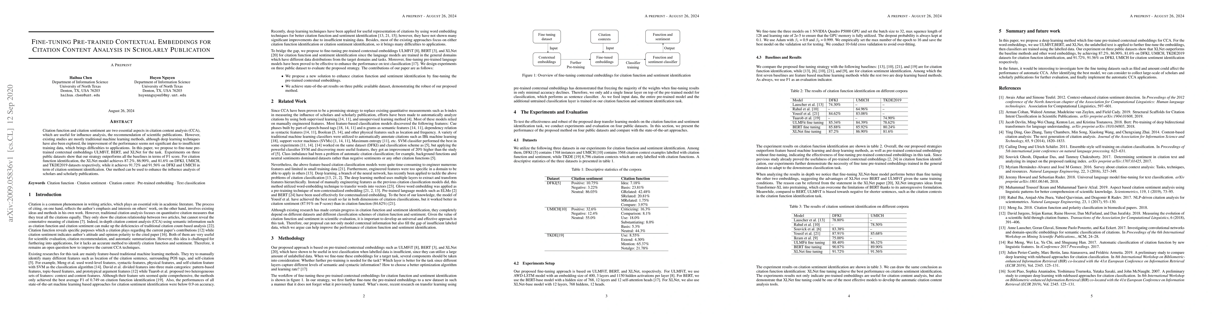 This paper proposes fine-tuning pre-trained contextual embeddings like ULMFiT, BERT, and XLNet for citation content analysis, achieving superior performance over traditional machine learning and other deep learning baselines. The XLNet model notably excels in citation function and sentiment identification, enhancing the influence analysis of scholarly publications.