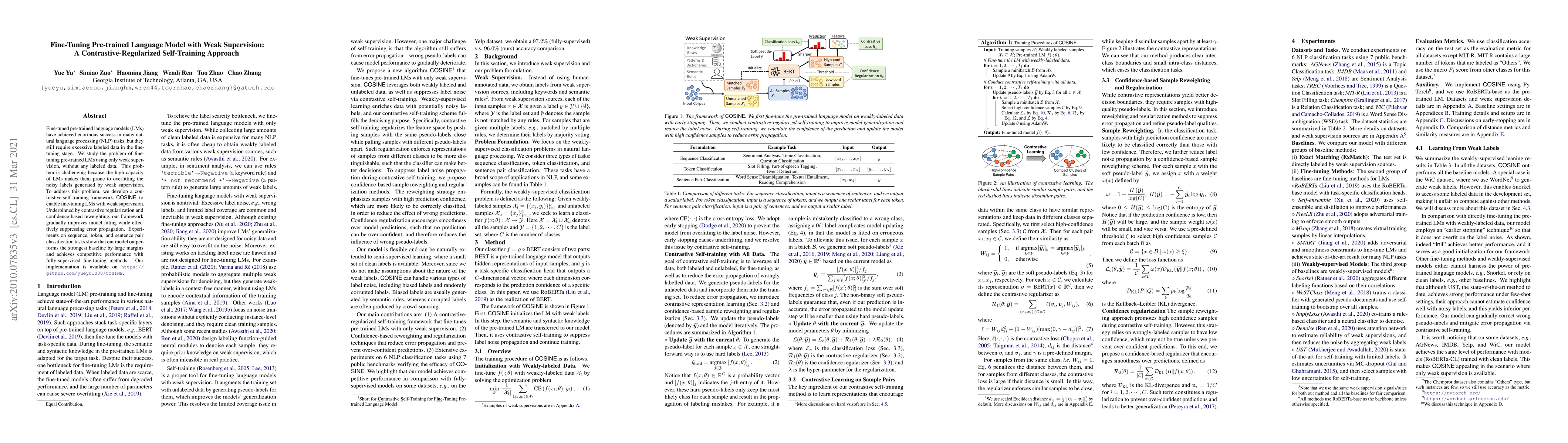 This paper proposes a contrastive self-training framework called COSINE to fine-tune pre-trained language models using only weak supervision, addressing the challenge of overfitting to noisy labels. The method achieves superior performance on various NLP tasks compared to strong baselines, demonstrating competitive results even without labeled data.