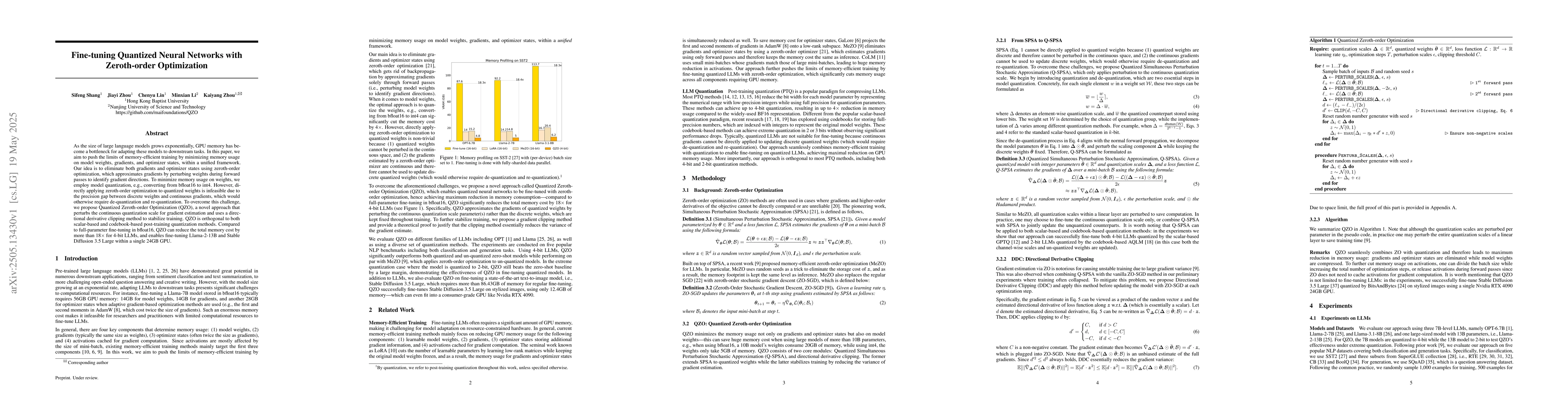 The introduction of Quantized Zeroth-order Optimization (QZO), a novel approach for memory-efficient fine-tuning of quantized neural networks by approximating gradients without requiring exact gradients or optimizer states.