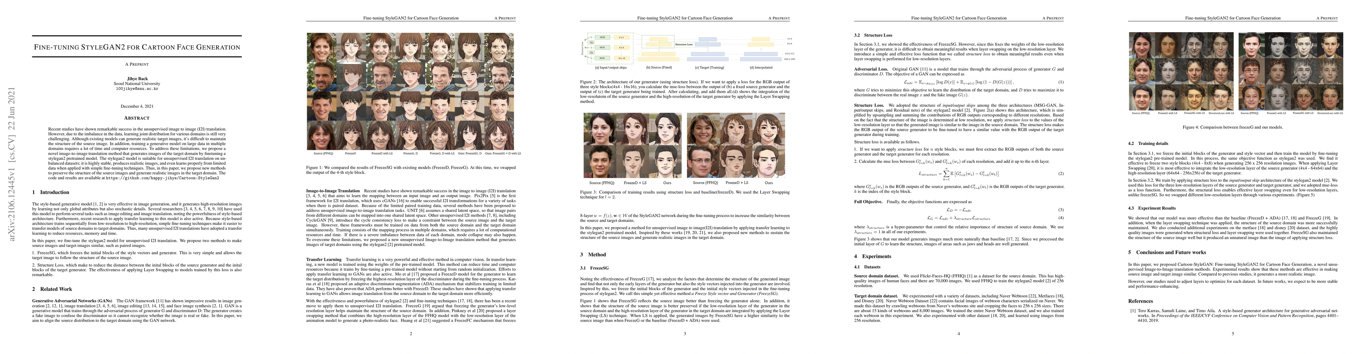 Recent studies have shown remarkable success in the unsupervised image to image (I2I) translation. However, due to the imbalance in the data, learning joint distribution for various domains is still very challenging. Although existing models can generate realistic target images, it's difficult to maintain the structure of the source image. In addition, training a generative model on large data in multiple domains requires a lot of time and computer resources. To address these limitations, we propose a novel image-to-image translation method that generates images of the target domain by finetuning a stylegan2 pretrained model. The stylegan2 model is suitable for unsupervised I2I translation on unbalanced datasets; it is highly stable, produces realistic images, and even learns properly from limited data when applied with simple fine-tuning techniques. Thus, in this paper, we propose new methods to preserve the structure of the source images and generate realistic images in the target domain. The code and results are available at https://github.com/happy-jihye/Cartoon-StyleGan2