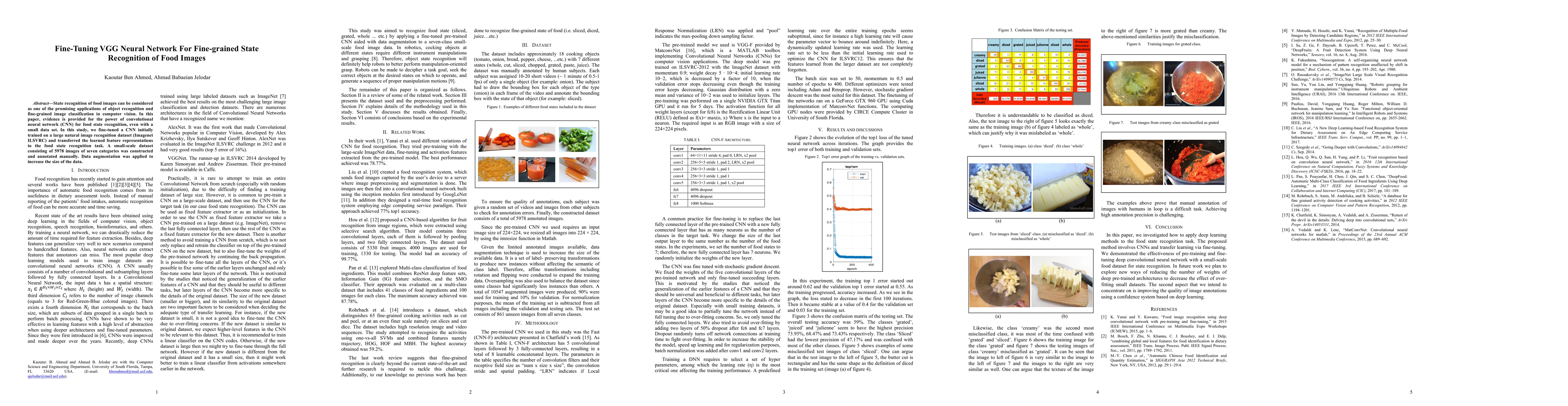 This paper fine-tunes a VGG neural network, pre-trained on ImageNet, for recognizing fine-grained states in food images using a small, manually annotated dataset of 5978 images. Data augmentation techniques were employed to enhance the dataset size.