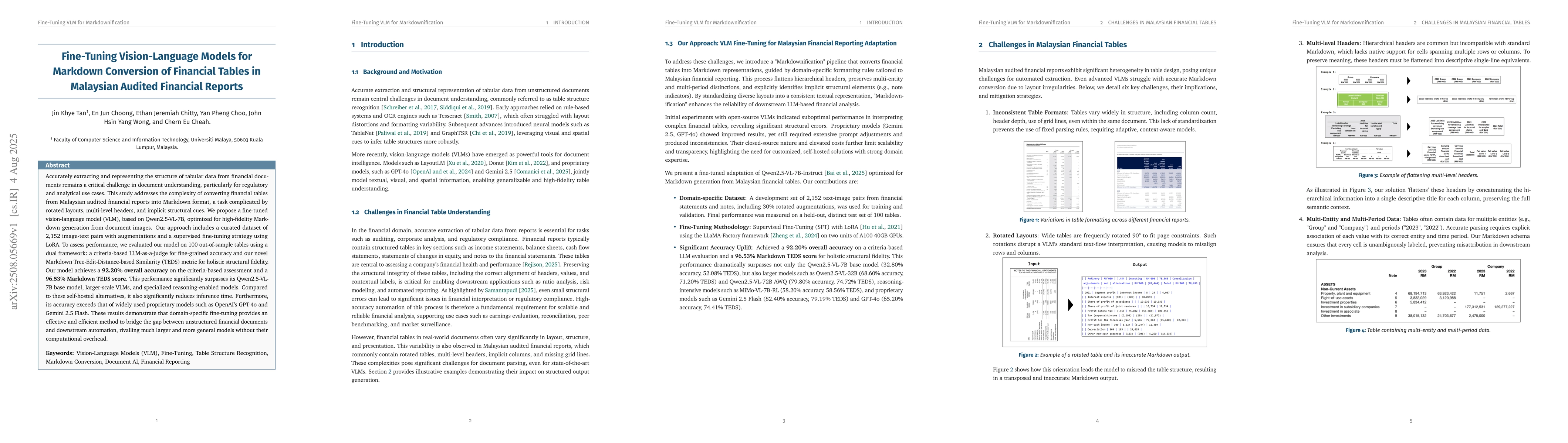 Accurately extracting and representing the structure of tabular data from financial documents remains a critical challenge in document understanding, particularly for regulatory and analytical use cases. This study addresses the complexity of converting financial tables from Malaysian audited financial reports into Markdown format, a task complicated by rotated layouts, multi-level headers, and implicit structural cues. We propose a fine-tuned vision-language model (VLM), based on Qwen2.5-VL-7B, optimized for high-fidelity Markdown generation from document images. Our approach includes a curated dataset of 2,152 image-text pairs with augmentations and a supervised fine-tuning strategy using LoRA. To assess performance, we evaluated our model on 100 out-of-sample tables using a dual framework: a criteria-based LLM-as-a-judge for fine-grained accuracy and our novel Markdown Tree-Edit-Distance-based Similarity (TEDS) metric for holistic structural fidelity. Our model achieves a 92.20% overall accuracy on the criteria-based assessment and a 96.53% Markdown TEDS score. This performance significantly surpasses its Qwen2.5-VL-7B base model, larger-scale VLMs, and specialized reasoning-enabled models. Compared to these self-hosted alternatives, it also significantly reduces inference time. Furthermore, its accuracy exceeds that of widely used proprietary models such as OpenAI's GPT-4o and Gemini 2.5 Flash. These results demonstrate that domain-specific fine-tuning provides an effective and efficient method to bridge the gap between unstructured financial documents and downstream automation, rivalling much larger and more general models without their computational overhead.