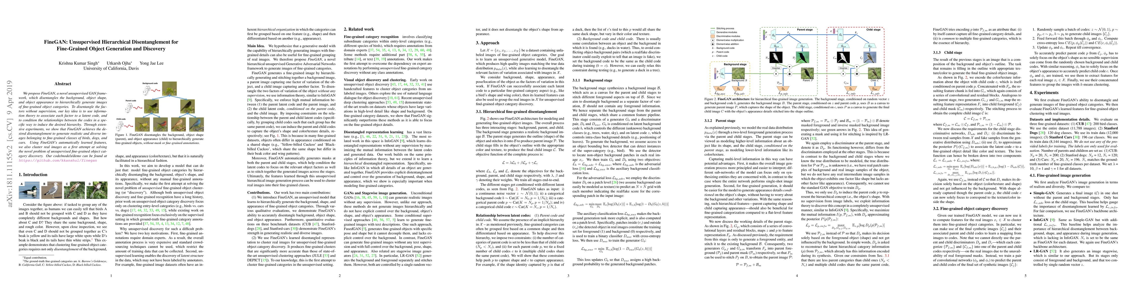 FineGAN is an unsupervised GAN framework that disentangles background, object shape, and appearance to generate fine-grained images. It uses information theory to associate latent codes with factors and condition their relationships to achieve hierarchical disentanglement, leading to realistic and diverse image generation for categories like birds, dogs, and cars.