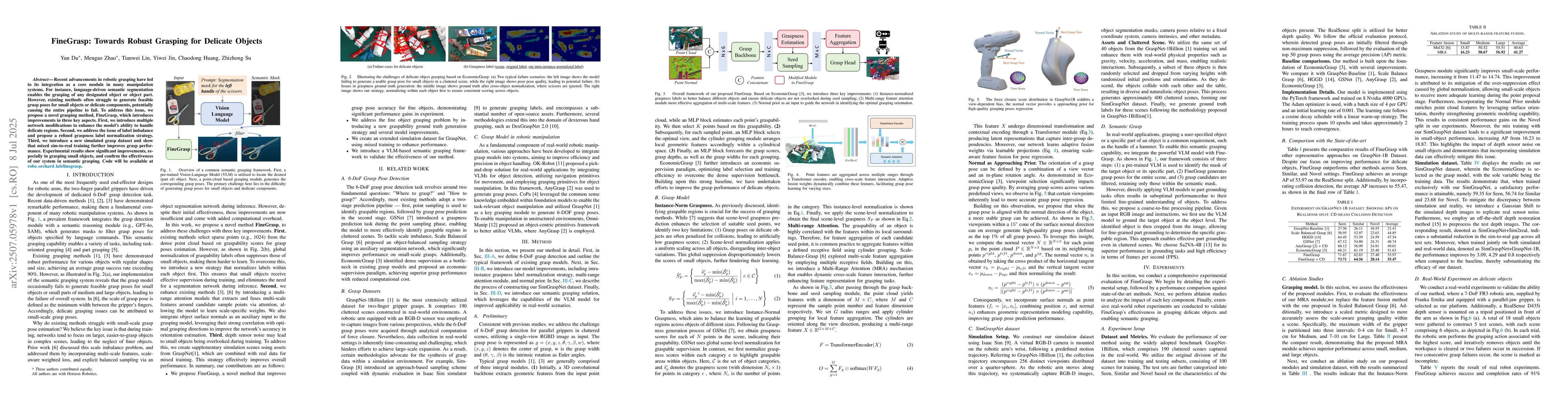 Recent advancements in robotic grasping have led to its integration as a core module in many manipulation systems. For instance, language-driven semantic segmentation enables the grasping of any designated object or object part. However, existing methods often struggle to generate feasible grasp poses for small objects or delicate components, potentially causing the entire pipeline to fail. To address this issue, we propose a novel grasping method, FineGrasp, which introduces improvements in three key aspects. First, we introduce multiple network modifications to enhance the ability of to handle delicate regions. Second, we address the issue of label imbalance and propose a refined graspness label normalization strategy. Third, we introduce a new simulated grasp dataset and show that mixed sim-to-real training further improves grasp performance. Experimental results show significant improvements, especially in grasping small objects, and confirm the effectiveness of our system in semantic grasping.