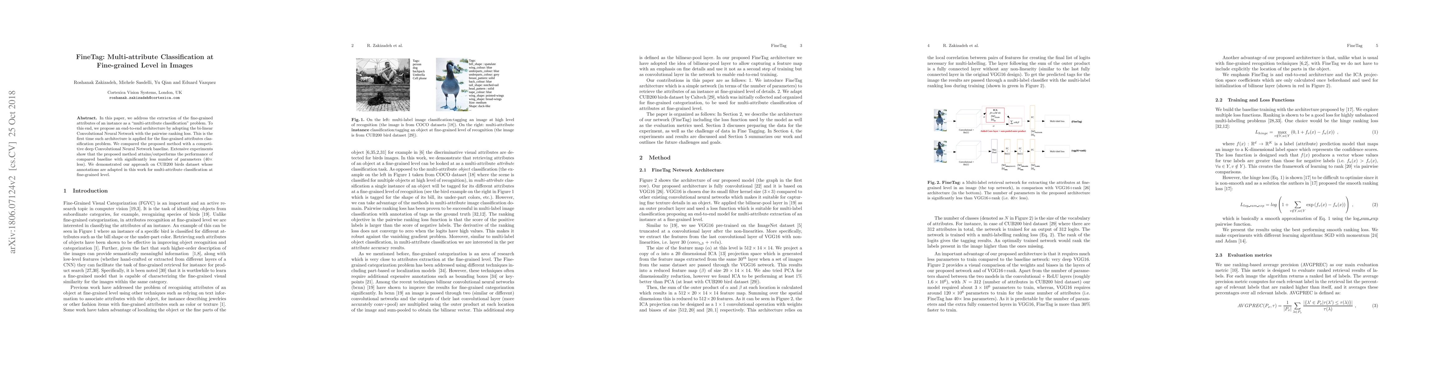 This paper proposes a fine-grained multi-attribute classification method using a bi-linear Convolutional Neural Network with a pairwise ranking loss, achieving superior performance compared to a deep CNN baseline with significantly fewer parameters. Experiments on the CUB200 birds dataset demonstrate the effectiveness of the proposed approach.